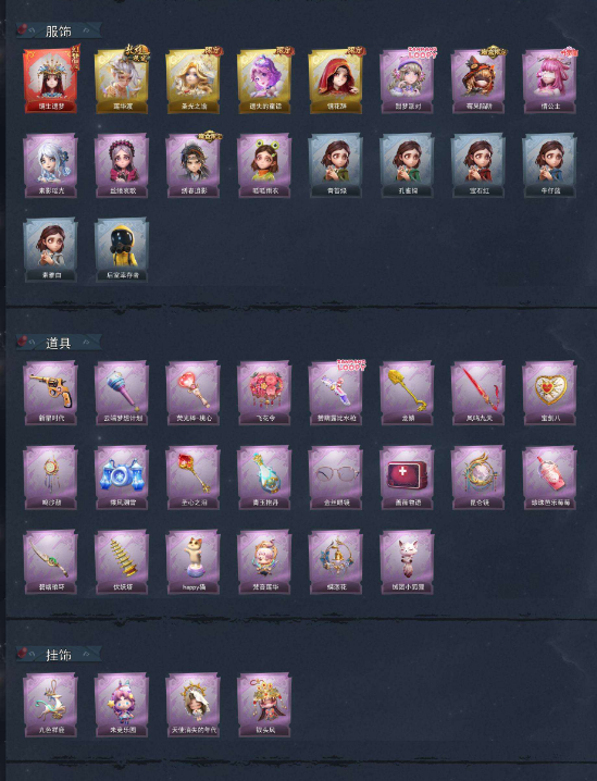 装备描述:巫铃儿-镜生遗梦 【金色皮肤】逍遥-莲华渡、薇薇安-圣光之谕、小黄-遗失的童话、巫铃儿-镜花辞 【紫色皮肤】爱丽丝-甜梦派对、莉莉-莓果陷阱、莉莉-情公主、巫铃儿-素影瑶光、爱丽丝-丝缕哀歌、逍遥-绣春逍影、小黄-呱呱雨衣 【道具皮肤】转轮手枪-新星时代、专业手电-云端梦想计划、额外的背包-飞花令、短管猎枪-赞萌露比水枪、铲子-龙鳞、桃木剑-凤鸣九天、腰包-宝剑八、音响-鸣沙鼓、喷气背包-乘风溯雪、铲子-圣心之泪、黄牛能量饮料-青玉抱丹、夜视仪-金丝眼镜、急救包-蔷薇物语、传送按钮-昆仑镜、黄牛能量饮料-珍珠芭乐莓莓、刺刀-碧络琅环、葫芦-伏妖塔、音响-happy猫、背饰-梵音莲华、背饰-蝶恋花 【头饰】精致露比头套、鱼头怪头套、烈焰红唇头套、大葱明头套、火爆了头套、面具马头套、哈士奇头套、萨卡班甲鱼头套、嘻嘻头套、滑稽头套、呆滞头套、卑微头套、咬咬鲨头套、炙热烧烤、像素朋克墨镜、后室幸存者头套 【挂饰】九色祥鹿、未竟乐园、天使消失的年代、钗头凤 【动作】七仔摇、luvaboy、鸳鸯戏、鹏友摇、舞台中心、带你逃跑吧、举牌、抬手、KT猫摇