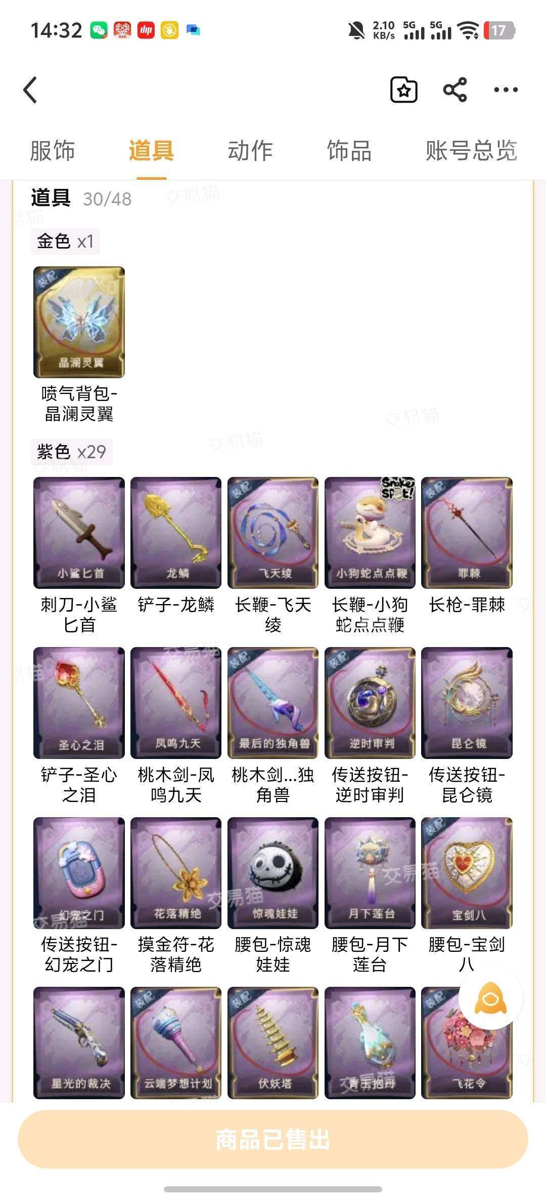 装备描述:巫铃儿-镜生遗梦 小黄-遗失的童话 逍遥-莲华渡 薇薇安-圣光之谕 巫铃儿-镜花辞 零-渡鸦公爵 紫色x14 阿念-迷途僵宝 薇薇安-仙锋小姐 莉莉-莓果陷阱 艾伦-黎明猎手 艾伦-绒绒对决 小黄-呱呱雨衣 爱丽丝-丝缕哀歌 零-搬开山 零-青云逸歌 阿念-王子与骑士 逍遥-绣春逍影 逍遥-泽引山海 莉莉-情公主 艾伦-水王子 道具 30/48 金色x1 喷气背包-晶澜灵翼 紫色x29 刺刀-小鲨匕首 铲子-龙鳞 长鞭-飞天绫 长鞭-小狗蛇点点鞭 长枪-罪棘 铲子-圣心之泪 桃木剑-凤鸣九天 桃木剑...独角兽 传送按钮-逆时审判 传送按钮-昆仑镜 传送按钮-幻宠之门 摸金符-花落精绝 腰包-惊魂娃娃 腰包-月下莲台 腰包-宝剑八 短管猎...的裁决 专业手...想计划 葫芦-伏妖塔 黄牛能...玉抱丹 额外的背包-飞花令 夜视仪-金丝眼镜 音响-happy猫 荧光棒-桃心 摸金符-紫霄 刺刀-碧络琅环 音响-鸣沙鼓 急救包-蔷薇物语 转轮手枪-新星时代 短管猎...比水枪 动作