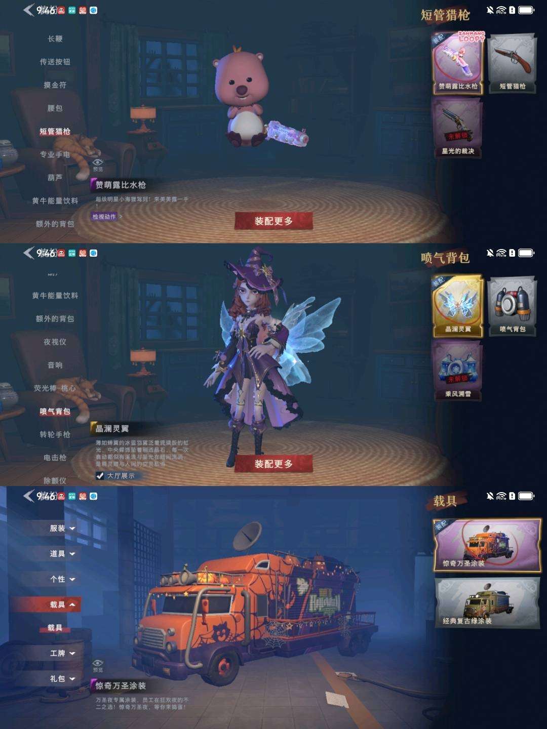 装备描述:【幻梦皮肤】巫铃儿-镜生遗梦 【金色皮肤】零-渡鸦公爵、逍遥-莲华渡、薇薇安-圣光之谕、巫铃儿-镜花辞 【紫色皮肤】兰-千夜星谕、零-搬开山、薇薇安-仙锋小姐、爱丽丝-甜梦派对、艾伦-绒绒对决、莉莉-莓果陷阱、小黄-异色序曲、莉莉-除妖小师妹、零-青云逸歌、巫铃儿-素影瑶光 【道具皮肤】喷气背包-晶澜灵翼、音响-鸣沙鼓、传送按钮-昆仑镜、夜视仪-心跳眼镜、长鞭-小狗蛇点点鞭、音响-happy猫、黄牛能量饮料-青玉抱丹、急救包-末章心跳、铲子-圣心之泪、短管猎枪-赞萌露比水枪、刺刀-小鲨匕首、桃木剑-凤鸣九天、额外的背包-飞花令、铲子-赞萌波板糖、铲子-龙鳞、摸金符-祝祷词、桃木剑-绯色遗证、摸金符-紫霄、电击枪-甜蜜泡泡枪、腰包-宝剑八、急救包-蔷薇物语、黄牛能量饮料-珍珠芭乐莓莓、夜视仪-金丝眼镜、传送按钮-逆时审判、葫芦-伏妖塔、腰包-惊魂娃娃、背饰-子夜证词、背饰-兜风日程、背饰-班卓琴、背饰-晚安仪式、背饰-潮汐小海兔、背饰-梵音莲华、背饰-天使的呼唤、背饰-蝶恋花 【载具】惊奇万圣涂装