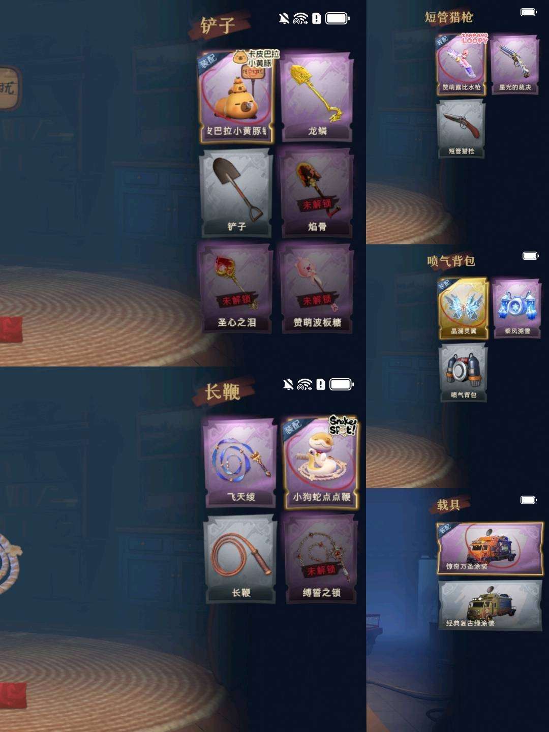装备描述:【幻梦皮肤】巫铃儿-镜生遗梦 【金色皮肤】逍遥-莲华渡、薇薇安-圣光之谕、小黄-遗失的童话、巫铃儿-镜花辞 【紫色皮肤】艾伦-黎明猎手、兰-千夜星谕、零-搬开山、爱丽丝-甜梦派对、艾伦-绒绒对决、莉莉-莓果陷阱、阿念-迷途僵宝、莉莉-除妖小师妹、阿念-王子与骑士、莉莉-情公主、艾伦-水王子、小黄-罗丽、巫铃儿-素影瑶光、爱丽丝-丝缕哀歌、逍遥-绣春逍影、小黄-呱呱雨衣 【道具皮肤】喷气背包-晶澜灵翼、腰包-月下莲台、额外的背包-飞花令、除颤仪-弦外之音、刺刀-紫气东来、桃木剑-最后的独角兽、夜视仪-金丝眼镜、长鞭-小狗蛇点点鞭、摸金符-花落精绝、腰包-私藏的银河、摸金符-祝祷词、黄牛能量饮料-青玉抱丹、桃木剑-绯色遗证、传送按钮-逆时审判、葫芦-伏妖塔、腰包-宝剑八、音响-鸣沙鼓、黄牛能量饮料-珍珠芭乐莓莓、铲子-龙鳞、铲子-卡皮巴拉小黄豚铲、长鞭-飞天绫、短管猎枪-赞萌露比水枪、刺刀-碧络琅环、电击枪-甜蜜泡泡枪、喷气背包-乘风溯雪、传送按钮-幻宠之门、桃木剑-凤鸣九天、音响-happy猫、摸金符-紫
