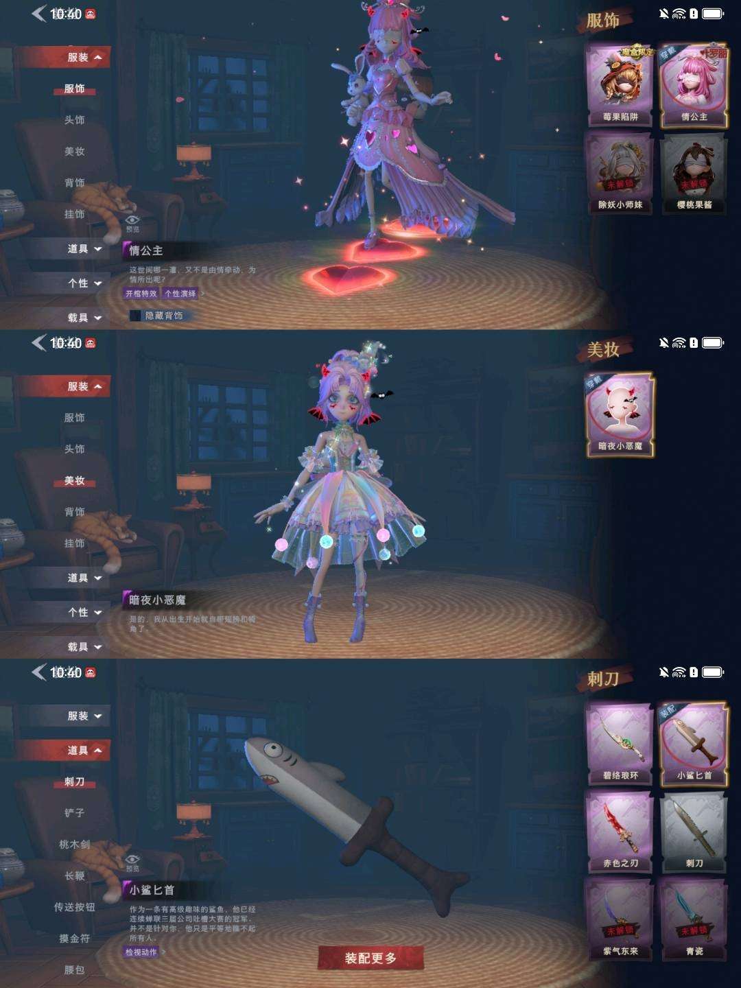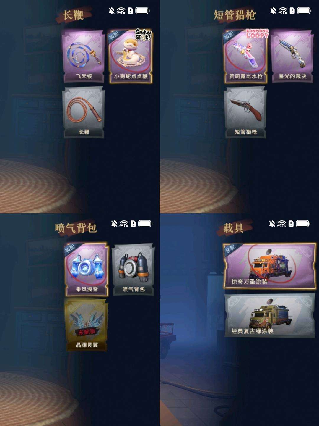 装备描述:金色皮肤】逍遥-莲华渡、薇薇安-圣光之谕、爱丽丝-血色中的玛丽、小黄-遗失的童话、巫铃儿-镜花辞 【紫色皮肤】莉莉-莓果陷阱、薇薇安-黑月挽歌、阿念-王子与骑士、莉莉-情公主、阿念-灵昭鹿鸣、爱丽丝-丝缕哀歌、逍遥-绣春逍影 【道具皮肤】音响-鸣沙鼓、喷气背包-乘风溯雪、桃木剑-凤鸣九天、长鞭-飞天绫、摸金符-紫霄、腰包-惊魂娃娃、铲子-赞萌波板糖、短管猎枪-赞萌露比水枪、专业手电-云端梦想计划、腰包-宝剑八、摸金符-祝祷词、桃木剑-最后的独角兽、长枪-荆棘、桃木剑-永眠曲、夜视仪-金丝眼镜、铲子-龙鳞、腰包-绯红柴郡猫、急救包-蔷薇物语、摸金符-花落精绝、短管猎枪-星光的裁决、转轮手枪-新星时代、刺刀-碧络琅环、音响-happy猫、传送按钮-幻宠之门、刺刀-赤色之刃、长鞭-小狗蛇点点鞭、刺刀-小鲨匕首、黄牛能量饮料-青玉抱丹、背饰-兜风日程、背饰-潮汐小海兔、背饰-兔先生的时钟、背饰-云梦之星、背饰-蝶恋花、背饰-毛球夹子、背饰-在逃小新娘 【美妆】暗夜小恶魔 【载具】惊奇万圣涂装