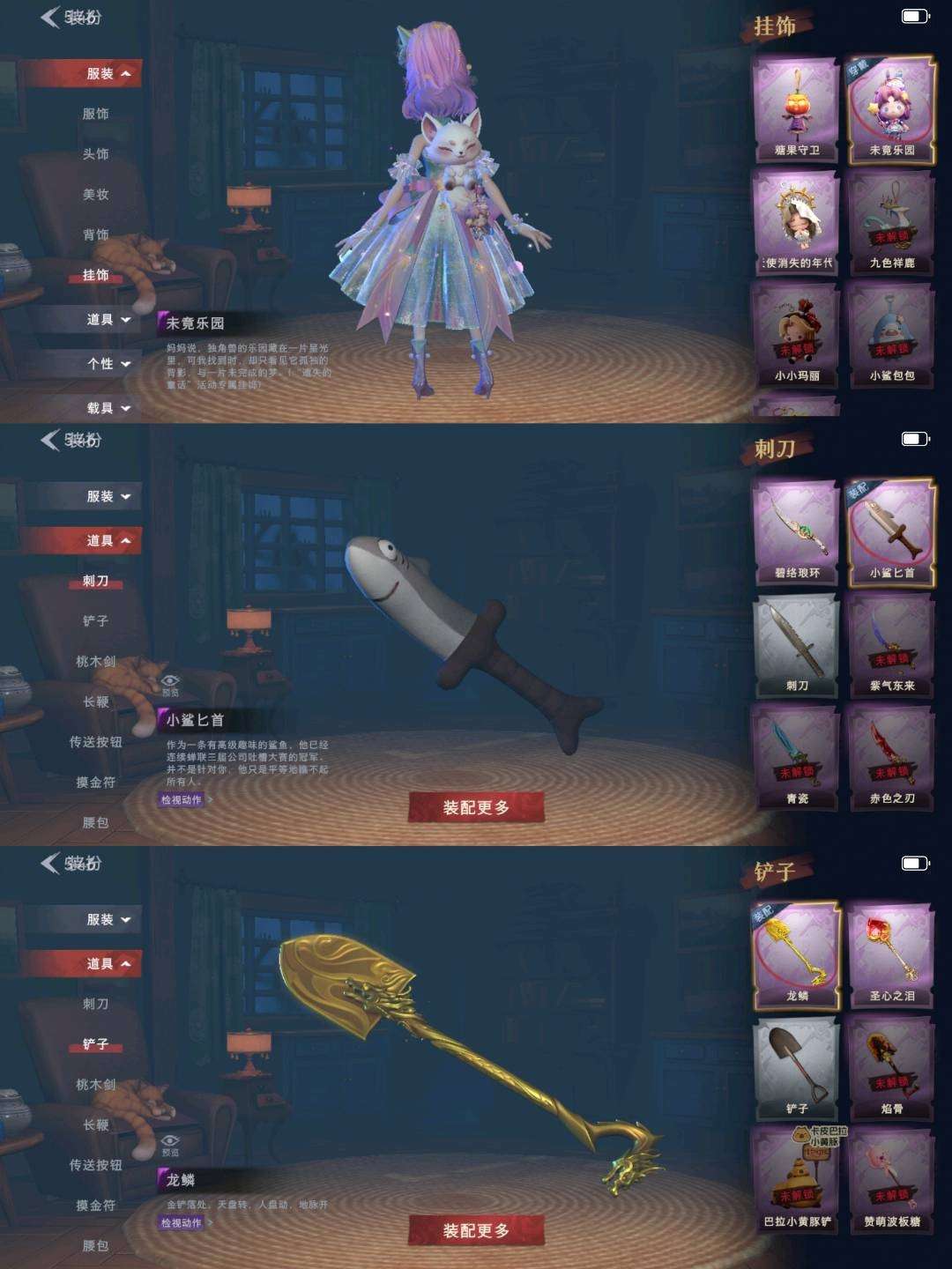 装备描述:【金色皮肤】薇薇安-圣光之谕、小黄-遗失的童话、巫铃儿-镜花辞 【紫色皮肤】阿念-王子与骑士、莉莉-情公主、爱丽丝-冰公主、逍遥-泽引山海、巫铃儿-素影瑶光、爱丽丝-丝缕哀歌、逍遥-绣春逍影、小黄-呱呱雨衣 【道具皮肤】传送按钮-昆仑镜、急救包-蔷薇物语、音响-鸣沙鼓、喷气背包-乘风溯雪、夜视仪-金丝眼镜、摸金符-花落精绝、腰包-宝剑八、刺刀-小鲨匕首、刺刀-碧络琅环、短管猎枪-星光的裁决、铲子-龙鳞、铲子-圣心之泪、桃木剑-最后的独角兽、转轮手枪-新星时代