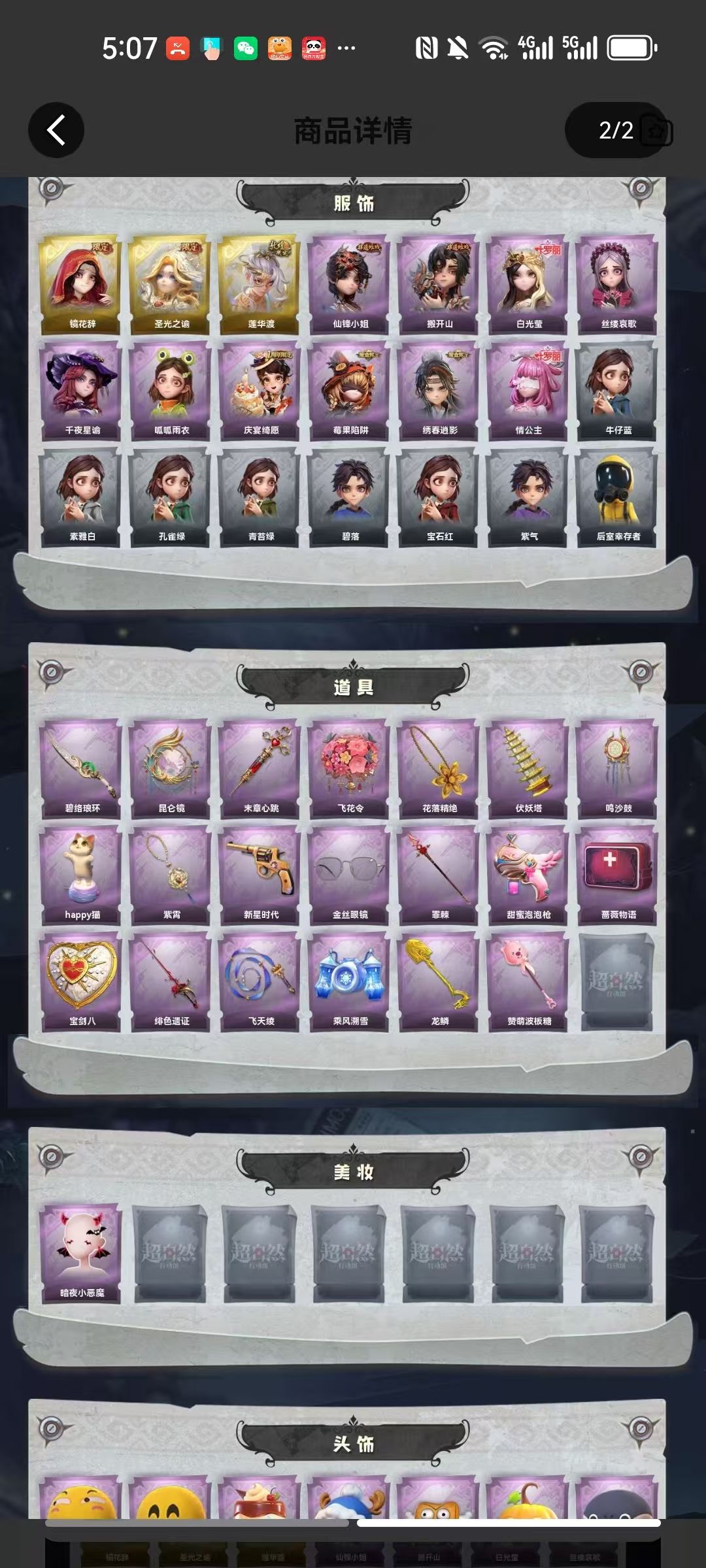 装备描述:皮肤:巫铃儿-镜花辞,薇薇安-圣光之谕,逍遥-莲华渡,薇薇安-仙锋小姐,零-搬开山,薇薇安-白光莹,爱丽丝-丝缕哀歌,兰-千夜星谕,小黄-呱呱雨衣,阿念-庆宴绮愿,莉莉-莓果陷阱,逍遥-绣春逍影,莉莉-情公主;道具:刺刀-碧络琅环,传送按钮-昆仑镜,急救包-末章心跳,额外的背包-飞花令,摸金符-花落精绝,葫芦-伏妖塔,音响-鸣沙鼓,音响-happy猫,摸金符-紫霄,转轮手枪-新星时代,夜视仪-金丝眼镜,长枪-罪棘,电击枪-甜蜜泡泡枪,急救包-蔷薇物语,腰包-宝剑八,桃木剑-绯色遗证,长鞭-飞天绫,喷气背包-乘风溯雪,铲子-龙鳞,铲子-赞萌波板糖;美妆:美妆-暗夜小恶魔;饰品:头饰-滑稽头套,头饰-嘻嘻头套,头饰-樱桃奶油布丁,头饰-雪墩墩头套,头饰-炙热烧烤,头饰-惊魂南瓜头套,头饰-萨卡班甲鱼头套,头饰-卑微头套,头饰-大葱明头套,头饰-哈士奇头套,头饰-火爆了头套,头饰-太空鲨头套,头饰-面具马头套,头饰-鱼头怪头套,头饰-烈焰红唇头套