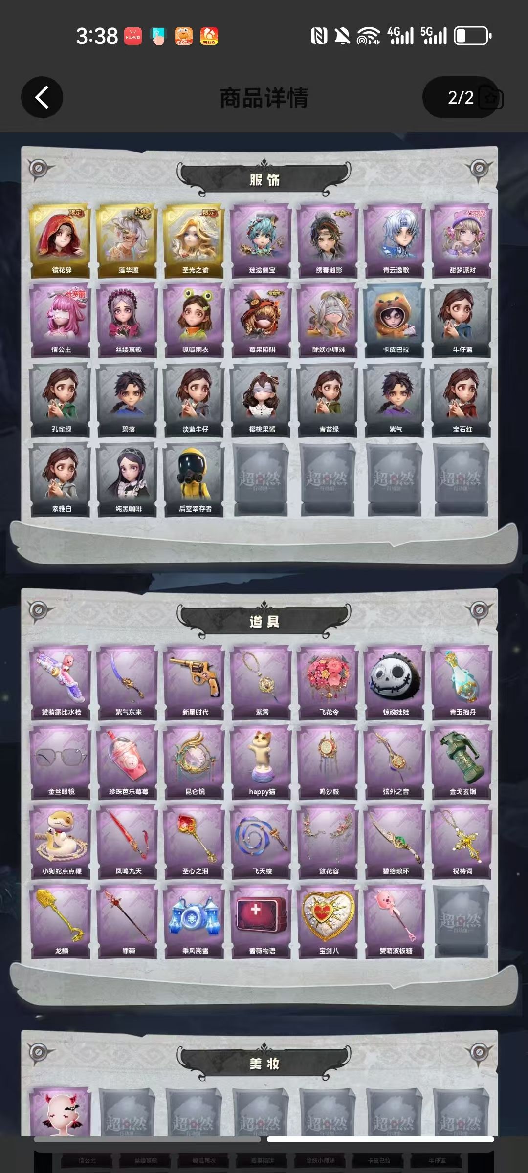 装备描述:皮肤:巫铃儿-镜花辞,逍遥-莲华渡,薇薇安-圣光之谕,阿念-迷途僵宝,逍遥-绣春逍影,零-青云逸歌,爱丽丝-甜梦派对,莉莉-情公主,爱丽丝-丝缕哀歌,小黄-呱呱雨衣,莉莉-莓果陷阱,莉莉-除妖小师妹;道具:短管猎枪-赞萌露比水枪,刺刀-紫气东来,转轮手枪-新星时代,摸金符-紫霄,额外的背包-飞花令,腰包-惊魂娃娃,黄牛能量饮料-青玉抱丹,夜视仪-金丝眼镜,黄牛能量饮料-珍珠芭乐莓莓,传送按钮-昆仑镜,音响-happy猫,音响-鸣沙鼓,除颤仪-弦外之音,闪光弹-金戈玄铜,长鞭-小狗蛇点点鞭,桃木剑-凤鸣九天,铲子-圣心之泪,长鞭-飞天绫,夜视仪-敛花容,刺刀-碧络琅环,摸金符-祝祷词,铲子-龙鳞,长枪-罪棘,喷气背包-乘风溯雪,急救包-蔷薇物语,腰包-宝剑八,铲子-赞萌波板糖;美妆:美妆-暗夜小恶魔;饰品:头饰-萨卡班甲鱼头套,头饰-樱桃奶油布丁,头饰-鱼头怪头套,头饰-烈焰红唇头套,头饰-卑微头套,头饰-滑稽头套,头饰-小狗蛇点点头套,头饰-大葱明头套,头饰-哈士奇头套,头饰-炙热烧烤,头饰-太空鲨头套,头饰-呆滞头套,头饰-惊魂南瓜头套,头饰-嘻嘻头套,头饰-雪墩墩头套,头饰-面具马