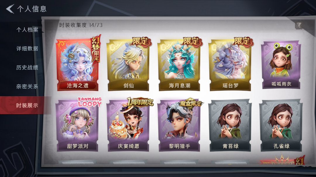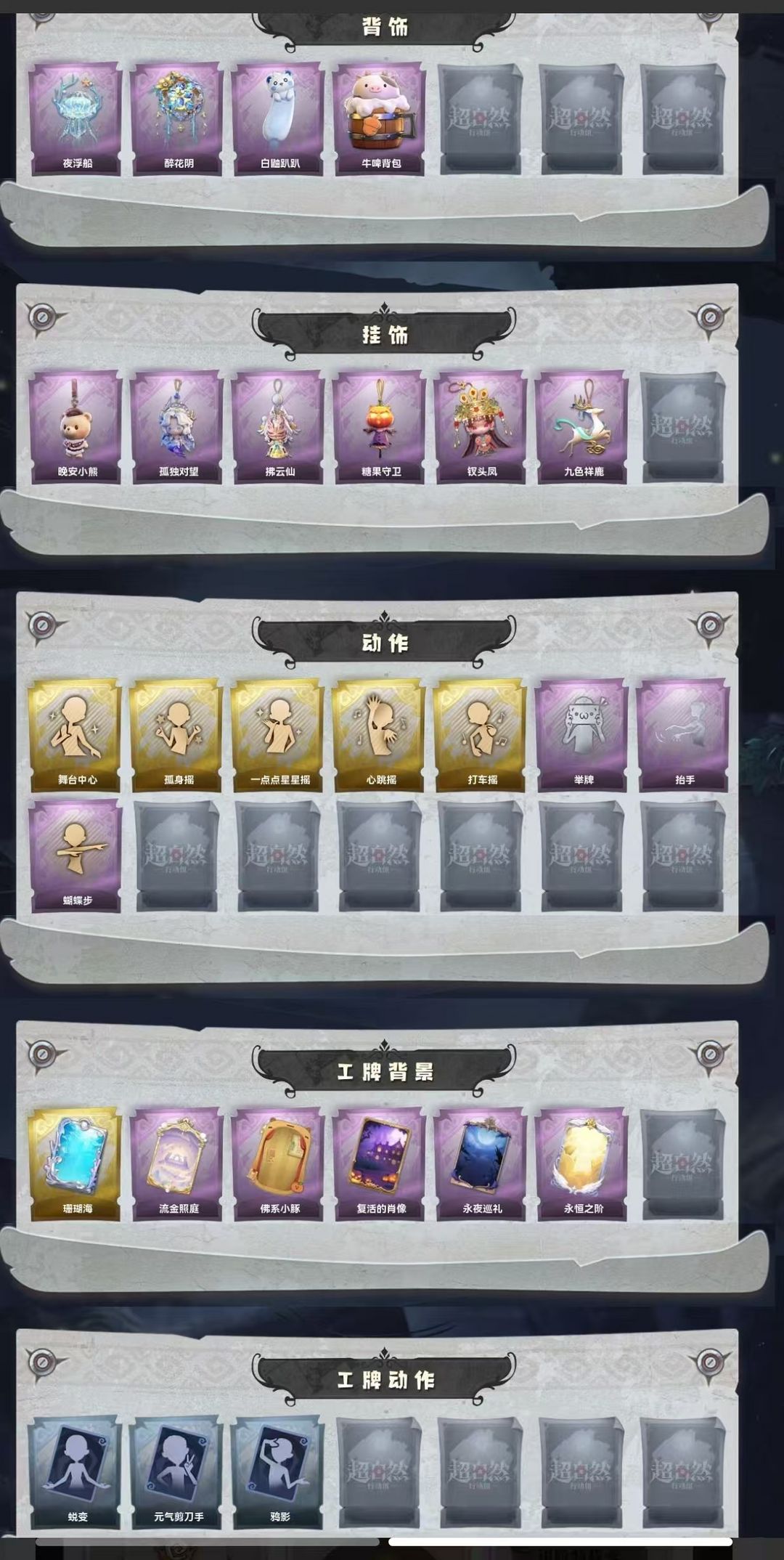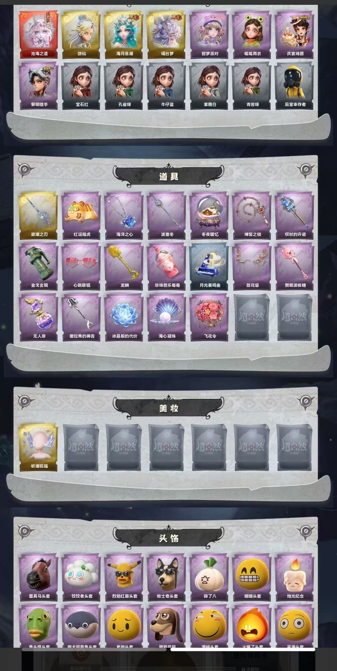 装备描述:薇薇安-沧海之遗 金色皮肤 莉莉-瑶台梦、逍遥-剑仙、薇薇安-海月息潮 紫色皮肤 小黄-呱呱雨衣、爱丽丝-甜梦派对、艾伦-黎明猎手、阿念-庆宴绮愿 道具皮肤 铲子-赞萌波板糖、铲子-龙鳞、额外的背包-飞花令、黄牛能量饮料-珍珠芭乐莓莓、夜视仪-心跳眼镜、长鞭-缚誓之锁、音响-冬夜暖忆、铲子-撒拉弗的祷告、夜视仪-花容、腰包-红运福虎、长枪-波塞冬、除颤仪-冰晶般的代价、电击枪-权杖的许诺、葫芦-海心凝珠、摸金符-海洋之心、桃木剑-寂潮之刃、音响-月光奏鸣曲 头饰 卑微头套、呆滞头套、哈士奇头套、滑稽头套、烈焰红唇头套、嘻嘻头套、面具马头套、鱼头怪头套、萨卡班甲鱼头套、火爆了头套、腊肠扭扭、、饺饺者头套 挂饰 钗头凤、九色祥鹿、糖果守卫、晚安小熊、拂云仙、孤独对望 背饰 白鼬趴趴、醉花阴、牛啤背包、夜浮船 金色动作 心跳摇、舞台中心、孤身摇、打车摇 紫色动作 抬手、举牌、蝴蝶步 员工 阿念、逍遥、薇薇安、巫铃儿、莉莉、艾伦、爱德华、兰、零、小满、小黄、爱丽丝、临云