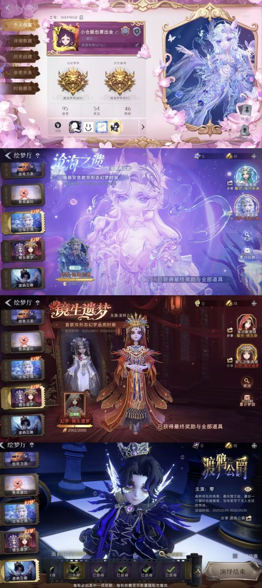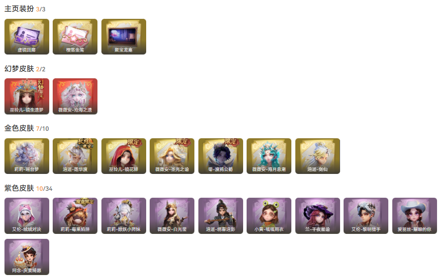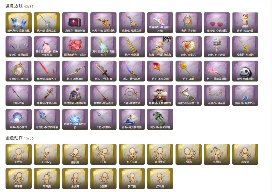 装备描述:红皮2;金皮7;紫皮10;道具皮43;皮肤:薇薇安-沧海之遗,巫铃儿-镜生遗梦,零-渡鸦公爵,薇薇安-海月息潮,薇薇安-圣光之谕,逍遥-莲华渡,巫铃儿-镜花辞,逍遥-剑仙,莉莉-瑶台梦,阿念-庆宴绮愿,小黄-呱呱雨衣,莉莉-莓果陷阱,艾伦-绒绒对决,莉莉-除妖小师妹,兰-千夜星谕,艾伦-黎明猎手,薇薇安-白光莹,逍遥-绣春逍影,爱丽丝-耀眼的你;道具:桃木剑-寂潮之刃,喷气背包-晶澜灵翼,急救包-土拨鼠捏捏,腰包-月下莲台,音响-happy猫,刺刀-小鲨匕首,转轮手枪-新星时代,铲子-圣心之泪,葫芦-海心凝珠,摸金符-祝祷词,刺刀-紫气东来,葫芦-伏妖塔,音响-鸣沙鼓,摸金符-海洋之心,夜视仪-金丝眼镜,急救包-末章心跳,长枪-波塞冬,夜视仪-心跳眼镜,刺刀-碧络琅环,音响-月光奏鸣曲,腰包-惊魂娃娃,除颤仪-弦外之音,传送按钮-逆时审判,传送按钮-浮生一梦,闪光弹-金戈玄铜,铲子-龙鳞,黄牛能量饮料-无人岸,除颤仪-冰晶般的代价,桃木剑-绯色遗证,传送按钮-昆仑镜,长鞭-缚誓之锁,铲子-赞萌波板糖,桃木剑-凤鸣九天,黄牛能量饮料-珍珠芭乐莓莓,额外的背包-飞花令,急救包-蔷薇物语,黄