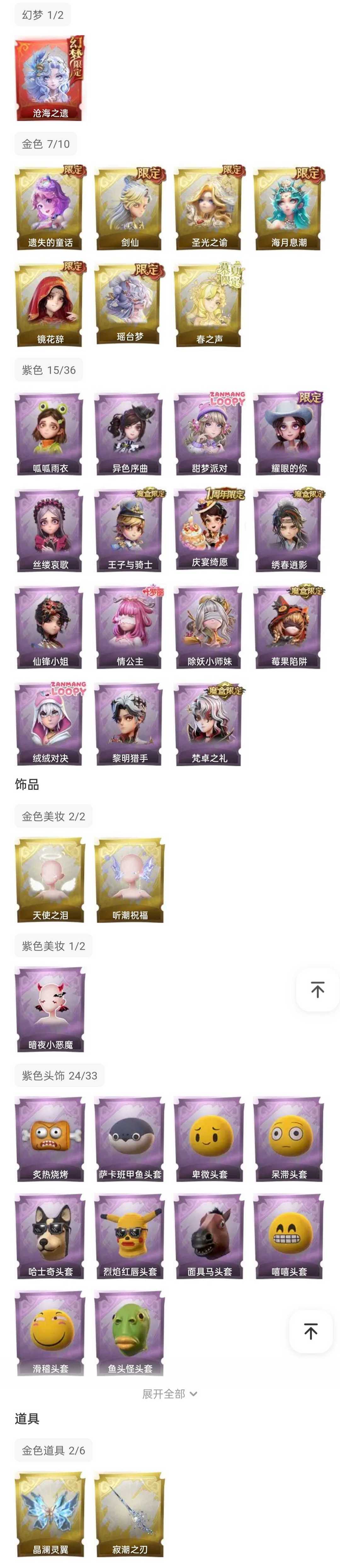 装备描述:幻梦皮肤】薇薇安-沧海之遗 【耀世皮肤】逍遥-剑仙、兰-春之声、薇薇安-海月息潮、莉莉-瑶台梦、薇薇安-圣光之谕、小黄-遗失的童话、巫铃儿-镜花辞 【典藏皮肤】艾伦-黎明猎手、爱德华-梵卓之礼、阿念-庆宴绮愿、爱丽丝-耀眼的你、薇薇安-仙锋小姐、爱丽丝-甜梦派对、艾伦-绒绒对决、莉莉-莓果陷阱、小黄-异色序曲、莉莉-除妖小师妹、阿念-王子与骑士、莉莉-情公主、爱丽丝-丝缕哀歌、逍遥-绣春逍影、小黄-呱呱雨衣 【白色皮肤】小黄-青苔绿、小黄-孔雀绿、小黄-宝石红、小黄-牛仔蓝、小黄-素雅白、小黄-后室幸存者 【道具皮肤】喷气背包-晶澜灵翼、闪光弹-金戈玄铜、长鞭-缚誓之锁、音响-happy猫、黄牛能量饮料-星空特调、传送按钮-逆时审判、铲子-赞萌波板糖、夜视仪-敛花容、短管猎枪-星光的裁决、摸金符-紫霄、黄牛能量饮料-珍珠芭乐莓莓、长枪-波塞冬、桃木剑-凤鸣九天、折扇-露露扇、摸金符-海洋之心、荧光棒-花火、铲子-龙鳞、额外的背包-灵感泉之花、腰包-私藏的银河、音响-鸣沙鼓、短管猎枪-赞萌露比水枪、音响-咏叹调、转轮手枪-新星时代、摸金符-祝祷词、闪光弹-邪恶滚滚猫、葫芦-海心凝珠、黄牛