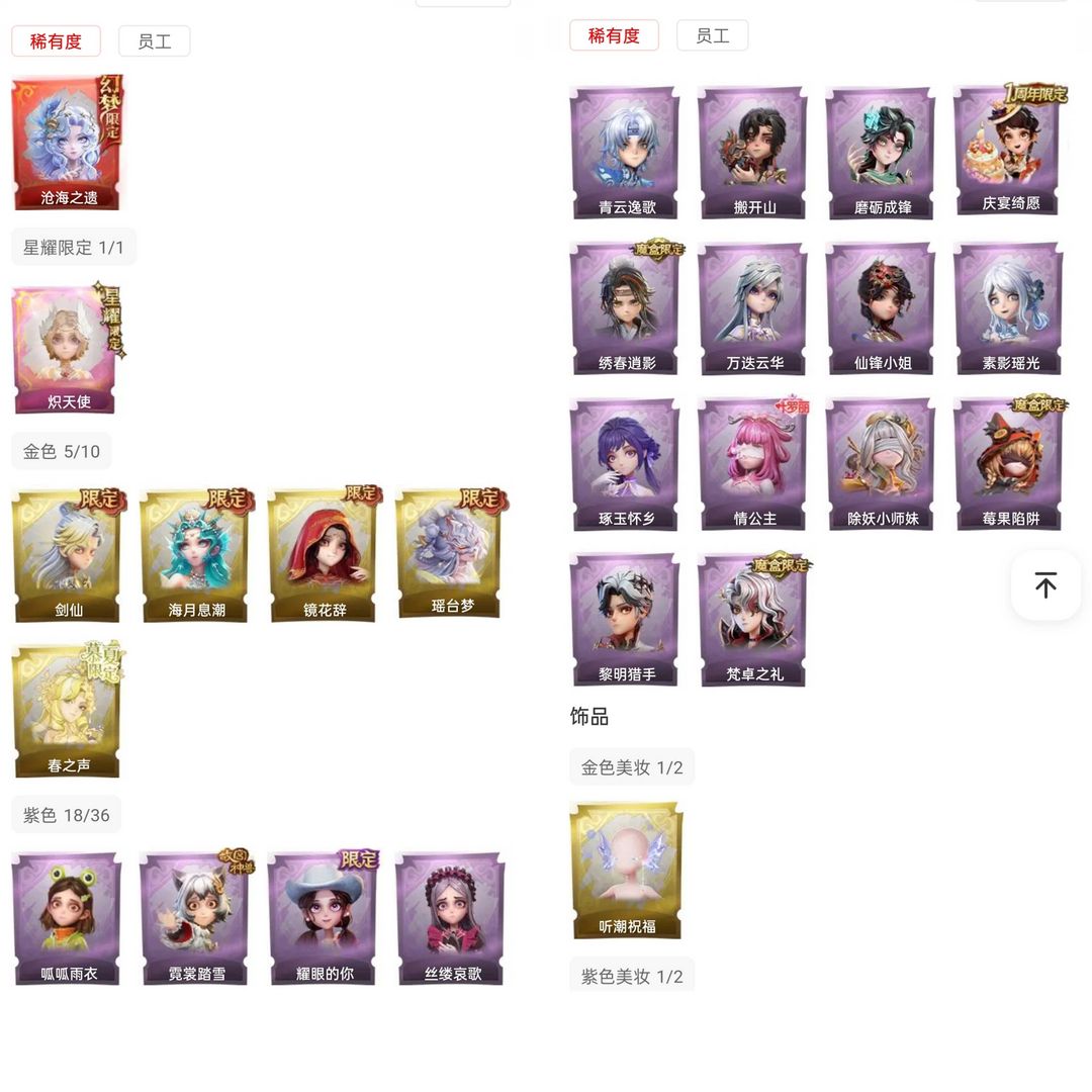 1粉1红5金18紫56道具♥沧海之遗♥炽天使♥瑶台梦♥剑仙♥梵卓之礼♥万迭云华♥莓果陷阱♥晶澜灵翼