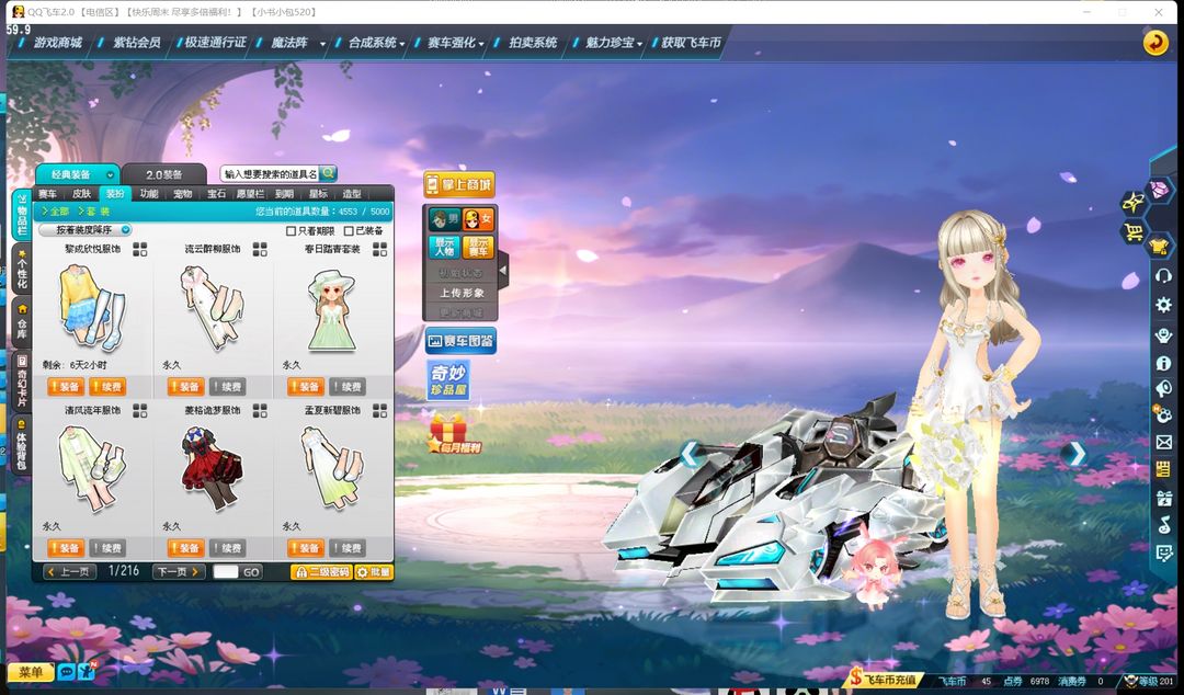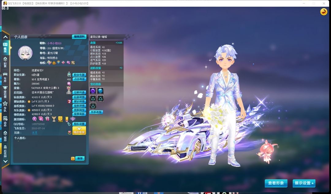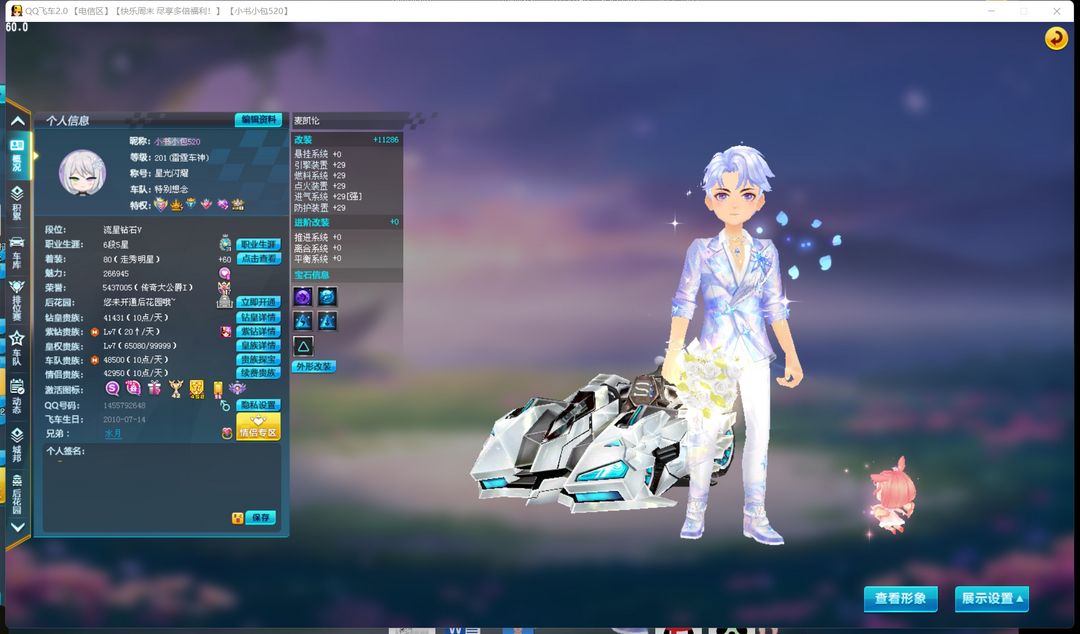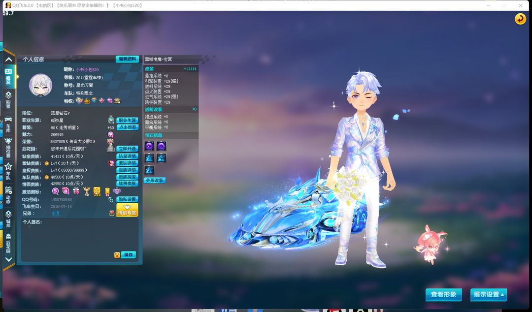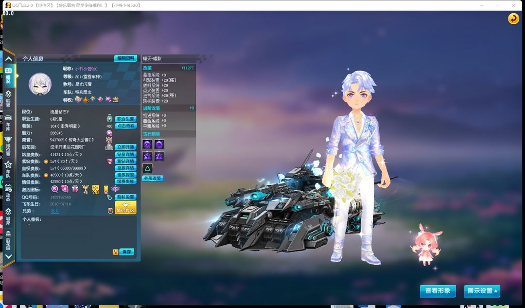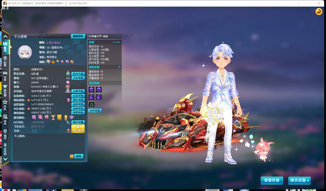 装备描述:【11S - 4满改】爆天甲·曜影9阶(全29 双四)= 终极爆天甲·逍遥(全29 双四)= 黑域电魔·玄冥(全29 双四)= 麦凯伦(全29 单四) = 星辰幻象·璀璨(单四),A车 幻星(准29,双三),雷诺·幻梦(全29 单四),地狱雷诺(全29 单四),魅力26万+,宠物:梅林婉香(强化10),艾丽莎(强化10),衣柜210多页,女性有一套稀世衣服