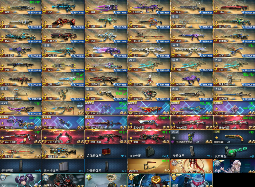 装备描述:配件崩雷丨巫灵丨渊瞳丨归墟血契丨星斗丨天际丨寂灭丨破魂丨岚翼丨乾坤丨海神之怒丨美杜莎之吻丨棱晶丨赤血之源丨焚风丨鬼刃修罗丨奏鸣丨藤木蔓芯丨幻宇星涡丨创世星环丨闪击丨尘埃 x2丨幽冥丨绝境丨玄天丨弧光丨无踪 x3丨黑炎丨连城丨核子裂变丨迷你派拉丨裂隙行者丨帝王战锤 x2丨伏虎丨灵狩丨原石之力丨獠牙丨含光承影丨戏法幻刃丨 彩金无极极丨天平贰丨巨阙贰丨广陵贰丨万象贰丨魅影贰丨撼天贰丨黯水晶-绝贰丨 传说星珀终焉丨神谕终焉丨神谕终焉丨无限EX丨无尽光影终焉丨SCAR-影魔丨屠魔丨 其他迷你液氮发生器丨火铳丨妙笔极丨摇摇乐丨 道具弹匣丨 皮肤皇家弹弓丨 角色炽霞丨露娜丨龙女丨阿瑞斯丨童子丨丧钟丨鲨皇丨