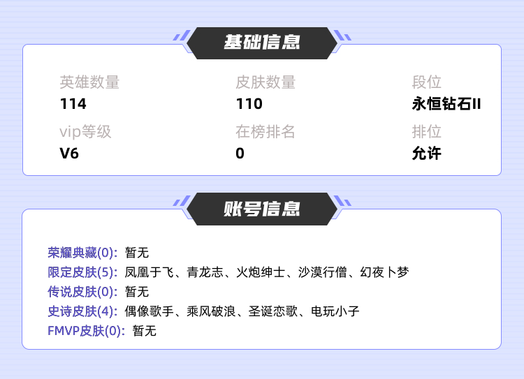 装备描述:>>>>>>毁号,涉及毁坏虚拟财产罪及计算机安全罪,请文明游戏素质游戏,让我们共建美好租号平台>>>>>> 本游戏账号: ,英雄多,皮肤多。 私人所属英雄皮肤有:王昭君 凤凰于飞||达摩 沙漠行僧||铠 青龙志||黄忠 火炮绅士夏侯惇 乘风破浪||鲁班七号 电玩小子,等等 注意事项: A.游戏过程中请不要恶意挂机或者不文明发言;B.恶意挂机、顶号等行为将被拉黑无法再次下单;C.进入游戏后中途请勿退出登陆,否则无法再次上号;D.部分账号由于异地登录可能会出现密码错误提示,通常再尝试5-6次后可上号。 |||||||||>喜欢本账号请点 ☆收藏☆ 方便下次租用,谢谢光临惠顾|||||||||