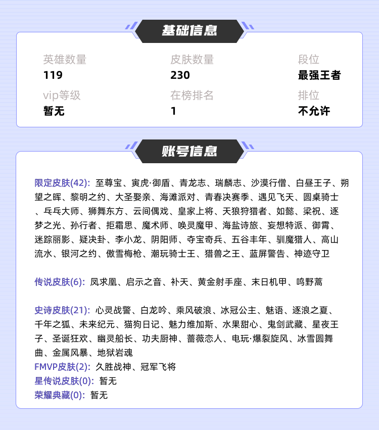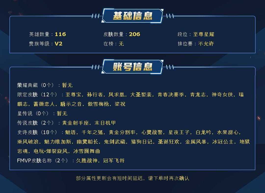 装备描述:毁号,涉及毁坏虚拟财产罪及计算机安全罪,请文明游戏素质游戏,让我们共建美好租号平台 本游戏账号: V8用户基础段位:永恒钻石IV英雄多皮肤多。典藏皮肤3个感受典藏皮肤带来的优质体验快感 私人所属英雄皮肤有:孙悟空 全息碎影夏侯惇 无限飓风号小乔 天鹅之梦赵云 淬星耀世虞姬 启明星使吕布 天魔缭乱李白 凤求凰武则天 海洋之心后羿 黄金射手座杨戬 永曜之星诸葛亮 武陵仙君孙尚香 末日机甲孙悟空 地狱火等等 注意事项: A.游戏过程中请不要恶意挂机或者不文明发言B.恶意挂机、顶号等行为将被拉黑无法再次下单C.进入游戏后中途请勿退出登陆,否则无法再次上号D.部分账号由于异地登录可能会出现密码错误提示,通常再尝试5-6次后可上号。 喜欢本账号请点 ☆收藏☆ 方便下次租用,谢谢光临惠顾