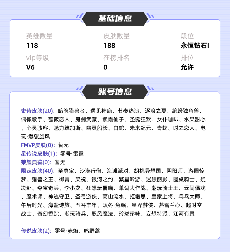 装备描述:>>>>>>毁号,涉及毁坏虚拟财产罪及计算机安全罪,请文明游戏素质游戏,让我们共建美好租号平台>>>>>> 本游戏账号: ,英雄多,皮肤多。 私人所属英雄皮肤有:孙悟空 零号·赤焰||桑启 鸣野蒿戈娅 驭风魔法||鬼谷子 五谷丰年||上官婉儿 梁祝||孙悟空 至尊宝||李元芳 银河之约||李元芳 妄想特派||桑启 海盐诗旅||庄周 高山流水||明世隐 疑决卦||嫦娥 拒霜思||嫦娥 暖冬·兔眠||狄仁杰 魔术师||狄仁杰 阴阳师||墨子 神迹守卫||王昭君 午后时光||后羿 圣弓游侠||刘邦 夺宝奇兵||米莱狄 御霄||米莱狄 胡桃异想国||阿古朵 江河有灵||扁鹊 奇幻香踪||元歌 云间偶戏||项羽 海滩派对||赵云 皇家上将||蔡文姬 繁星吟游||甄姬 游园惊梦||甄姬 落雪兰心||盾山 圆桌骑士||裴擒虎 李小龙||雅典娜 单词大作战||吕布 猎兽之王||亚瑟 潮玩骑士王||西施 玲珑珍味||钟无艳 超时空战士||杨戬 潮玩骑兵||鲁班大师 乓乓大师||暃 如果发下违规发言立马扣除押金并且永久拉黑追究法律责任 注意事项: A.游戏过程中请不要恶意挂机或者不文明发