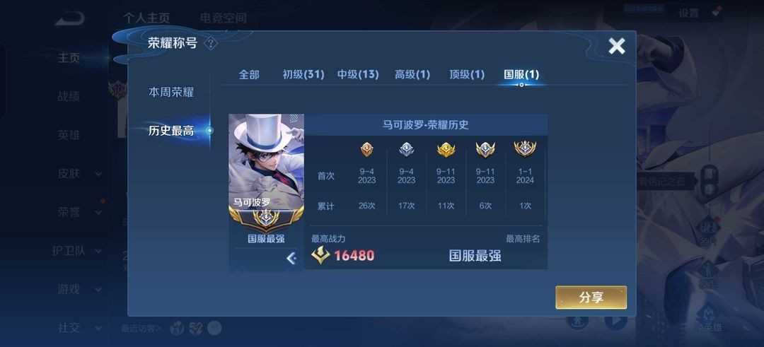 离恨烟⚡1.64W战力大国服马可波罗怪盗基德✨国标孙尚香⚡62段发育路✨魔方亮✨巅峰万强2400