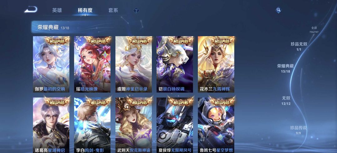 【736皮V10】❤️满无双✨满珍品✨满传说✨16水晶✨怪盗基德✨朽木白哉✨女号✨打野