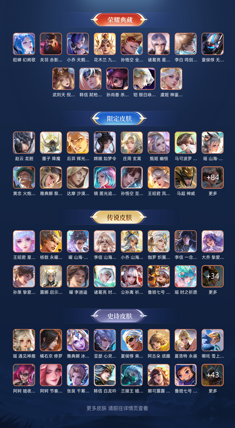 装备描述:V10 414皮7典藏1无双碎月剑心弑枪猎影银白咏叹调无限飓风号鸣剑·曳影天鹅之梦 皮肤数量:414 荣耀水晶:7 [珍品无双皮肤]: [无双数量]:1 [珍品数量]:0 [传说数量]:39 [限定数量]:176 [无双皮肤]:李白-碎月剑心 [珍品传说皮肤]: [荣耀典藏]:韩信-弑枪猎影/铠-银白咏叹调/夏侯惇-无限飓风号/李白-鸣剑·曳影/孙悟空-全息碎影/鲁班七号-星空梦想/小乔-天鹅之梦 [传说皮肤]:桑启-鸣野蒿/孙策-乘龙·淬吴钩/赵云-乘龙·铭钟鼎/孙尚香-乘龙·问璇玑/马超-琥珀纪元/艾琳-觅芳踪/诸葛亮-鹤羽星尊/张飞-百相守梦/夏洛特-浮生妄/孙悟空-齐天大圣/曜-山海·苍雷引/小乔-山海·琳琅生/李信-山海·炽霜斩/李白-诗剑行/虞姬-云霓雀翎/橘右京-枫霜尽/鲁班七号-寅虎·瑞焰/裴擒虎-寅虎·赤拳/孙尚香-异界灵契/伽罗-太华/赵云-淬星耀世/曜-李逍遥 /兰陵王-默契交锋/诸葛亮-时雨天司/公孙离-祈雪灵祝/虞姬-启明星使/孙悟空-零号·赤焰/李信-一念神魔/百里玄策-白虎志/花木兰-冠军飞将/吕布-天魔缭乱/杨戬-永曜之星/诸葛亮-武陵仙君/李白-凤求凰