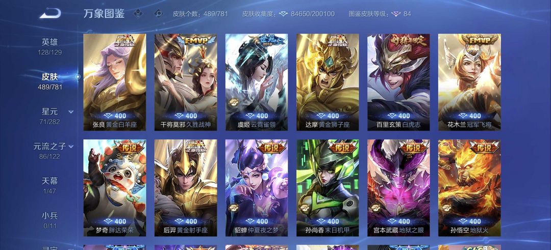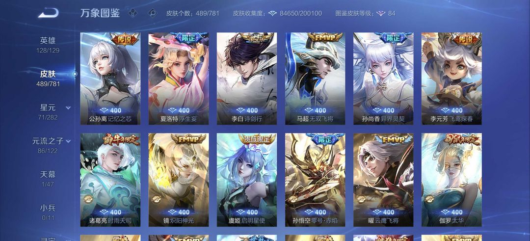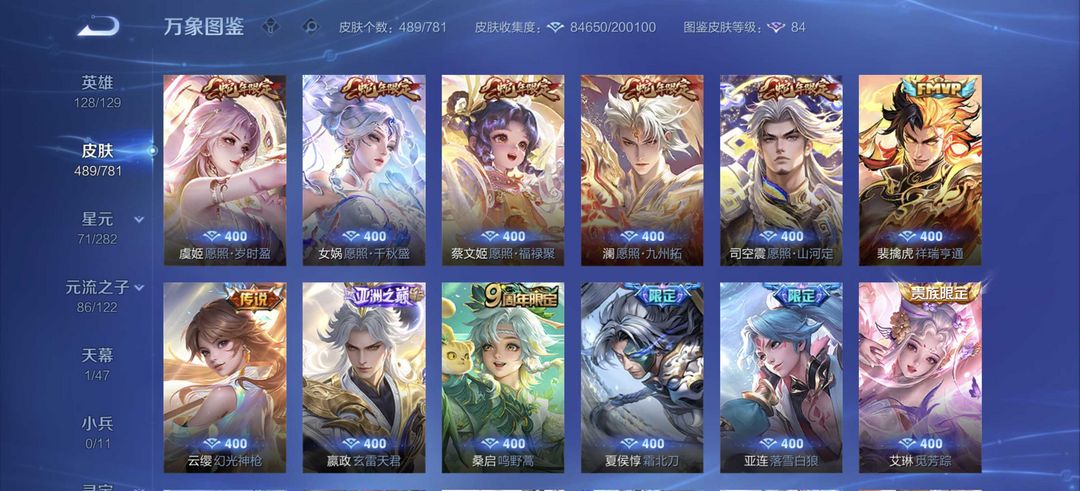 V10全皮肤共享,489款皮肤,图鉴等级84,含3荣耀典藏(安琪拉/瑶/铠)、2无双限定(曜/公孙离