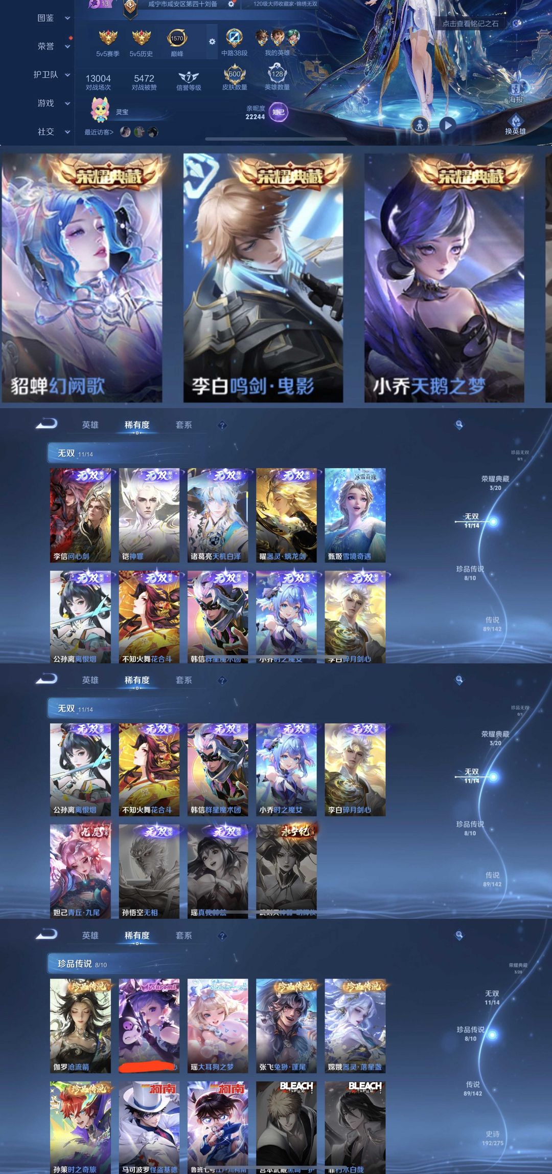 限制: 租号2次及以上 | 撤单率<49%才可租用此帐号装备描述:时间到了还登录白玩或者顶号全部改密拉黑处理永不解除,顶号机器会秒禁玩改密,顶号不仅拉黑还没得玩,赚三两块不容易,请理解谢谢。 ❤❤❤❤❤❤❤❤❤❤❤❤❤❤❤ 请勿开挂,挂机,送头,骂人,撤单后游戏等如有违规永久拉黑永不解除。 重置二级密码不要费劲了,号主每天都会上号查看,多行不义必自毙,人在做天在看,多做好事多自律,少做缺德事。 该号英雄128个皮肤600个,典藏3个,无双11个,珍品传说8个,星传说4个,传说89个,史诗192个,祝你游戏愉快~
