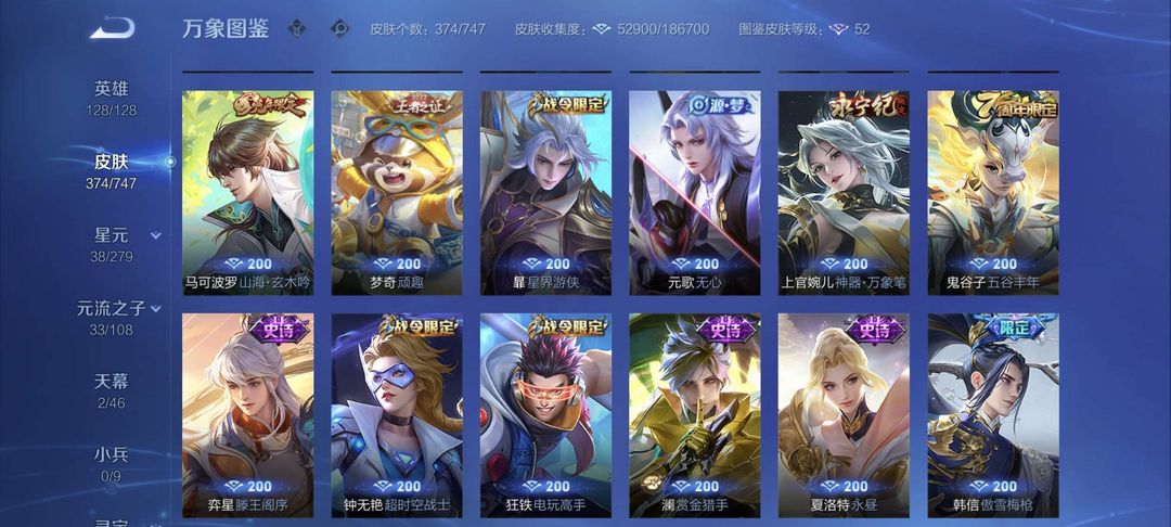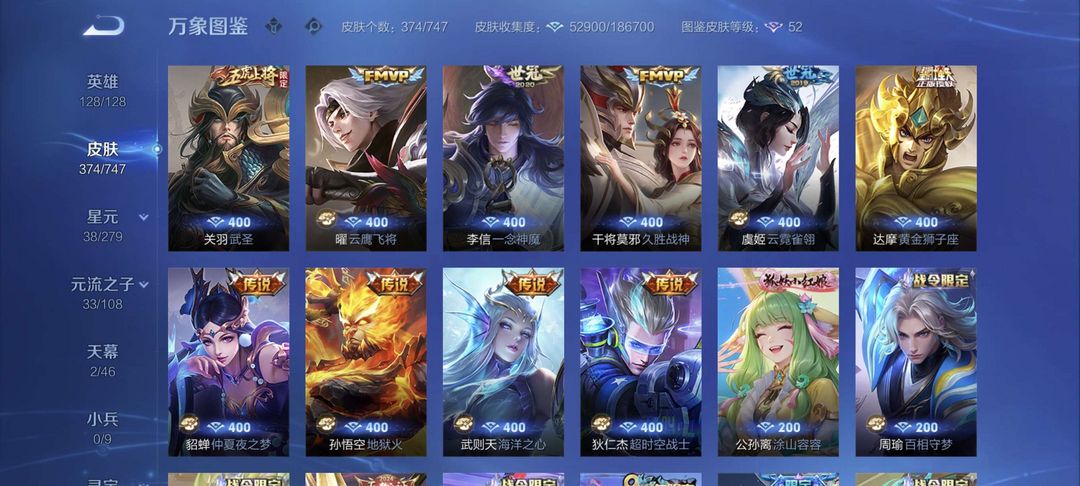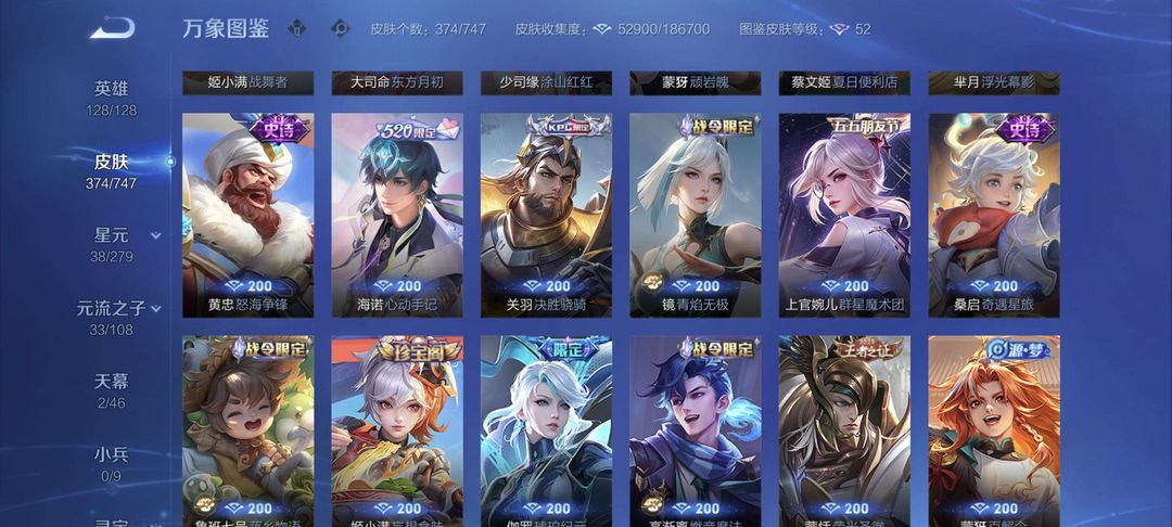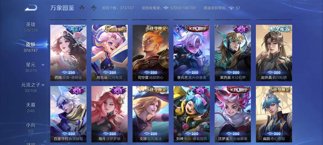 V8号,全英雄,有武则天星传说和诸葛荣耀皮,三百皮肤
