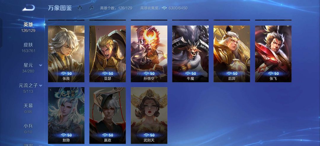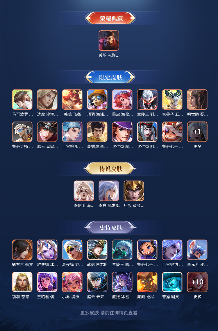 关羽荣耀典藏,李白凤求凰,韩信五岳,马超无双,还有很多稀有皮肤总共160多个皮肤,英雄只有三个无