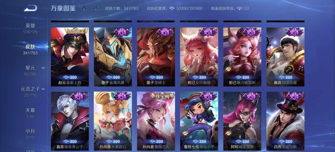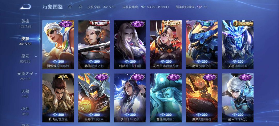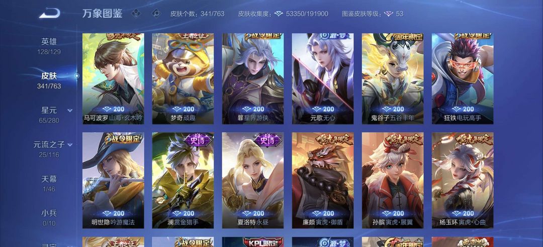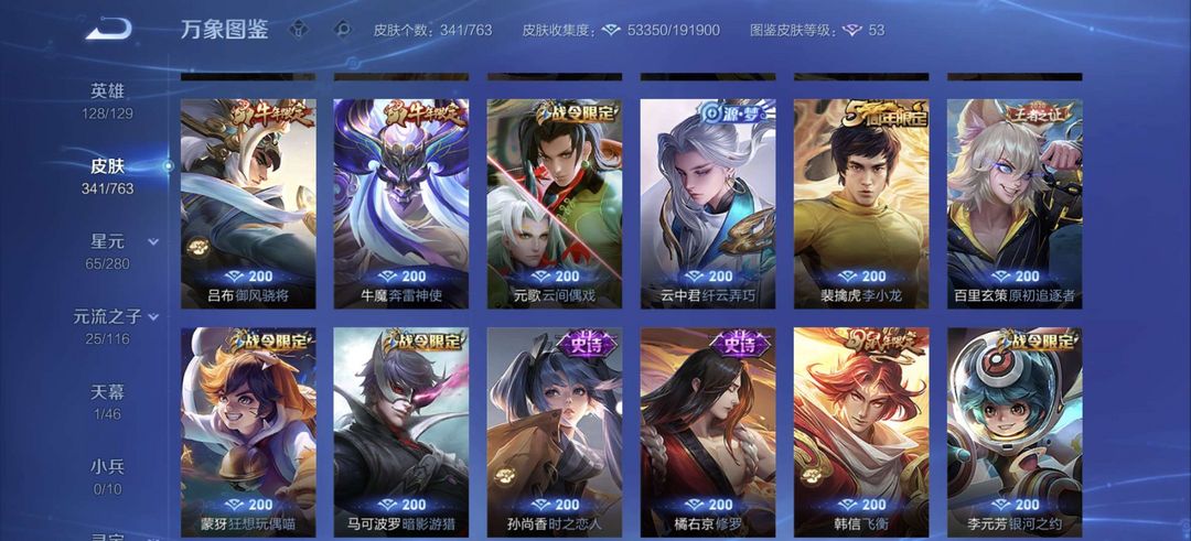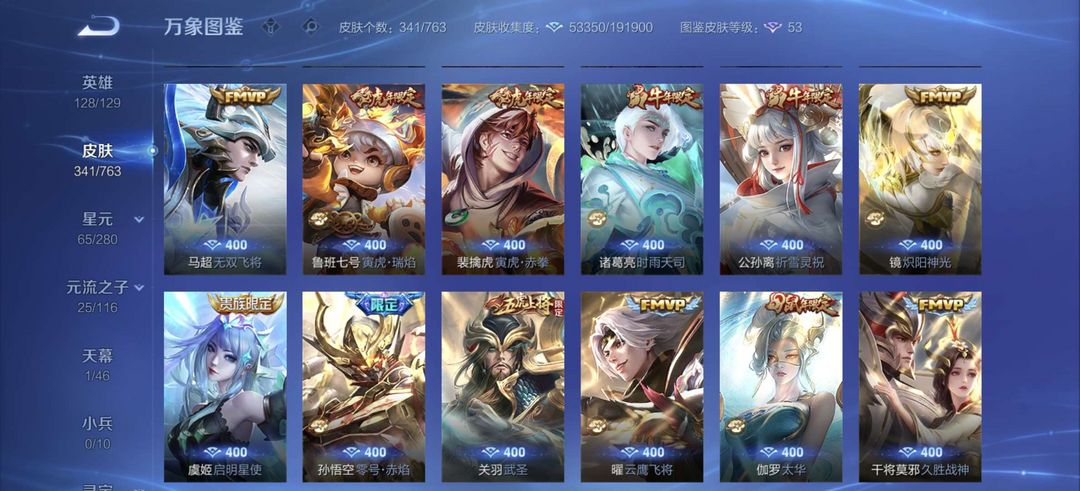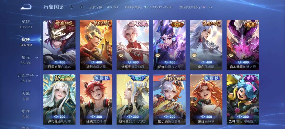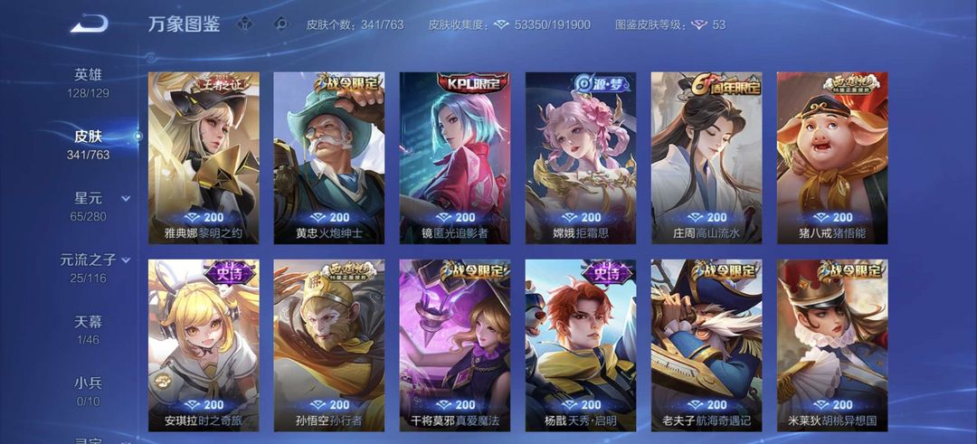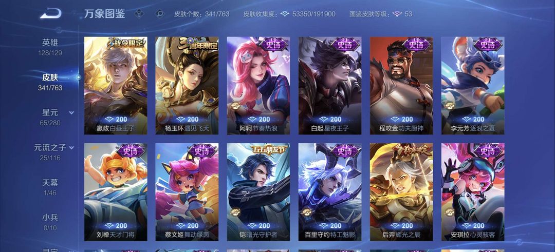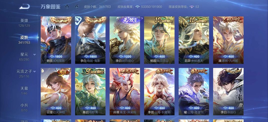 装备描述:李白全皮差一,杨戬全特效皮,牛年虎年全皮