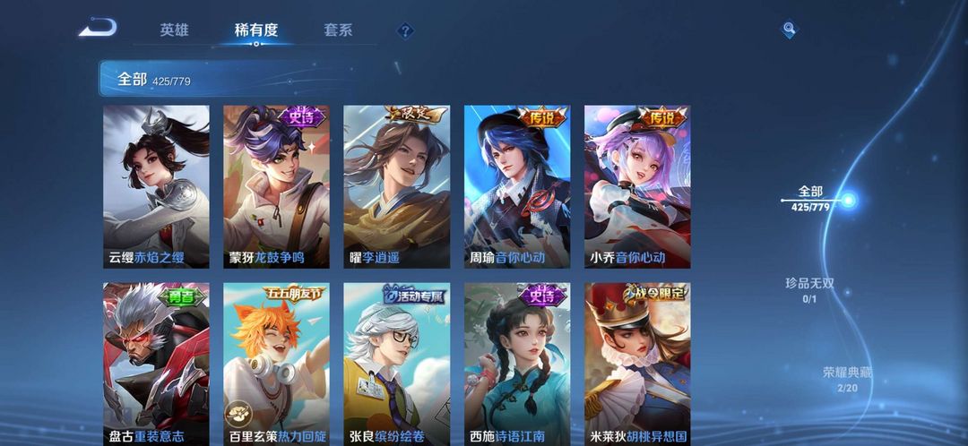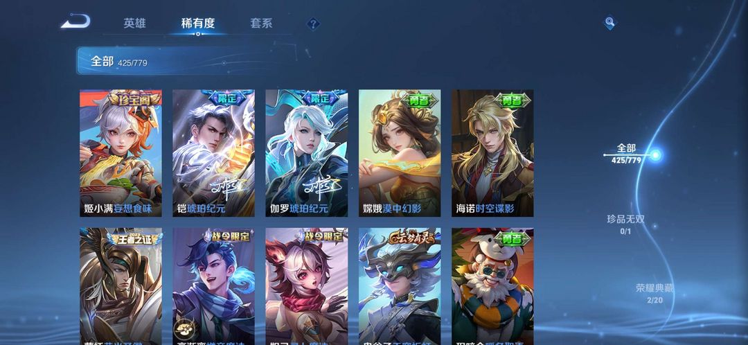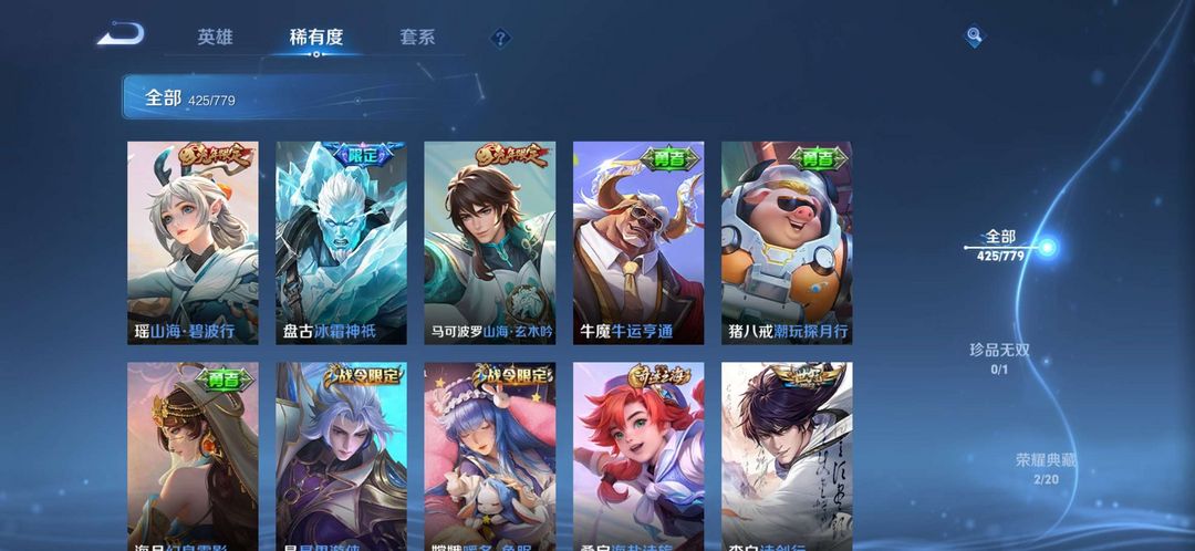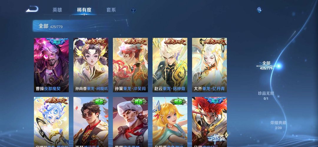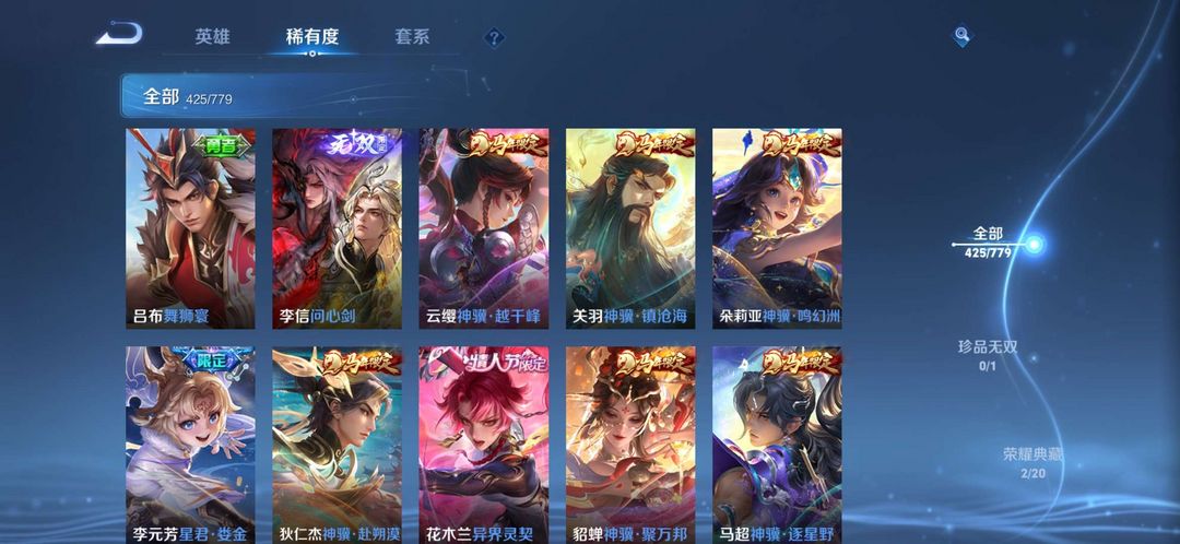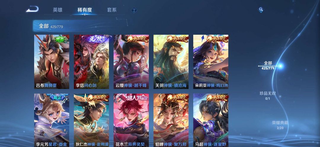 马年全套,李信无双有动作,李元芳、曹操、盘古充值限定,李逍遥,白虎志等稀有皮肤,贵族9。