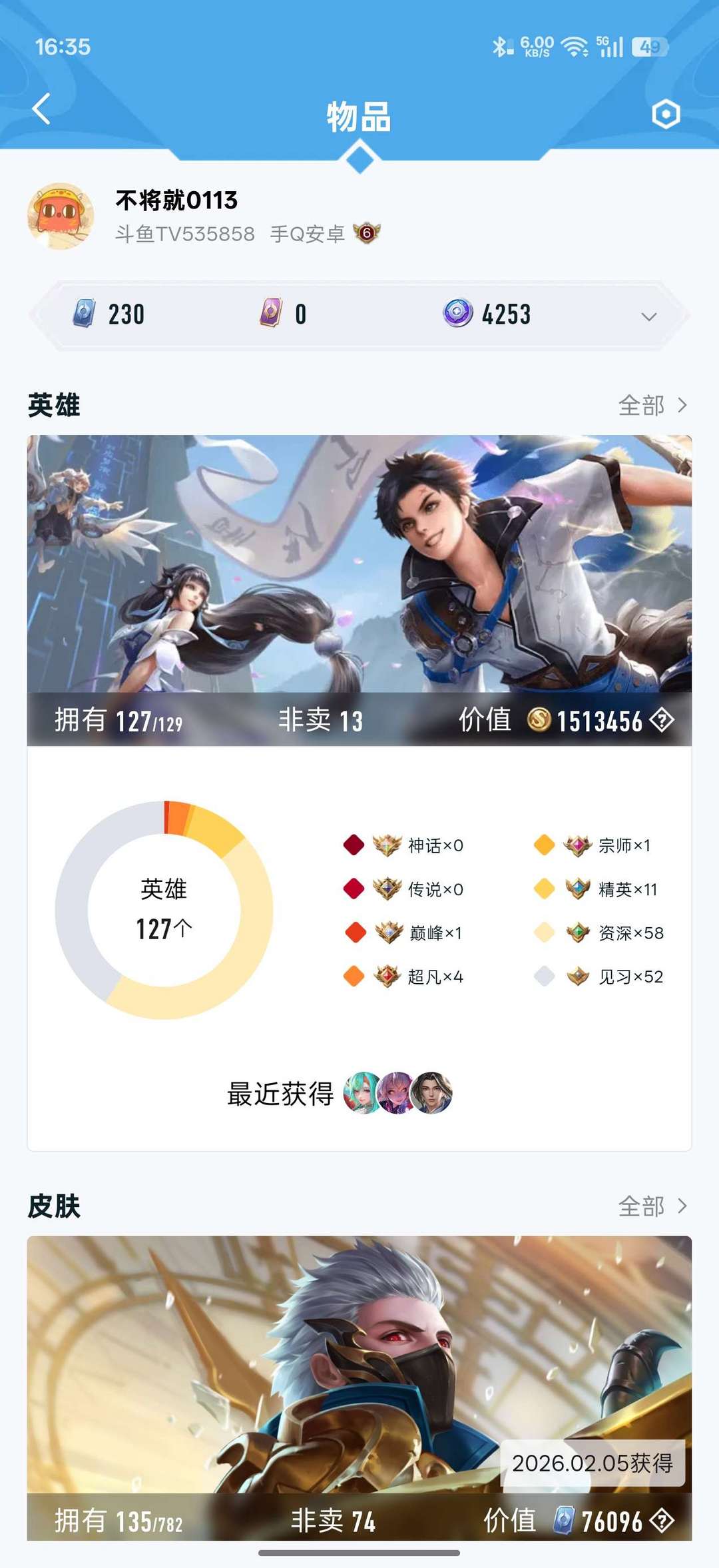 127英雄,130款皮肤,无不良记录,无封禁,无禁言,可排位