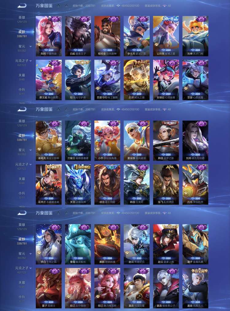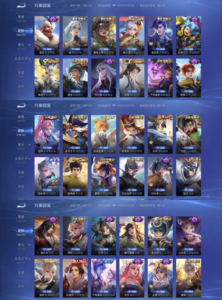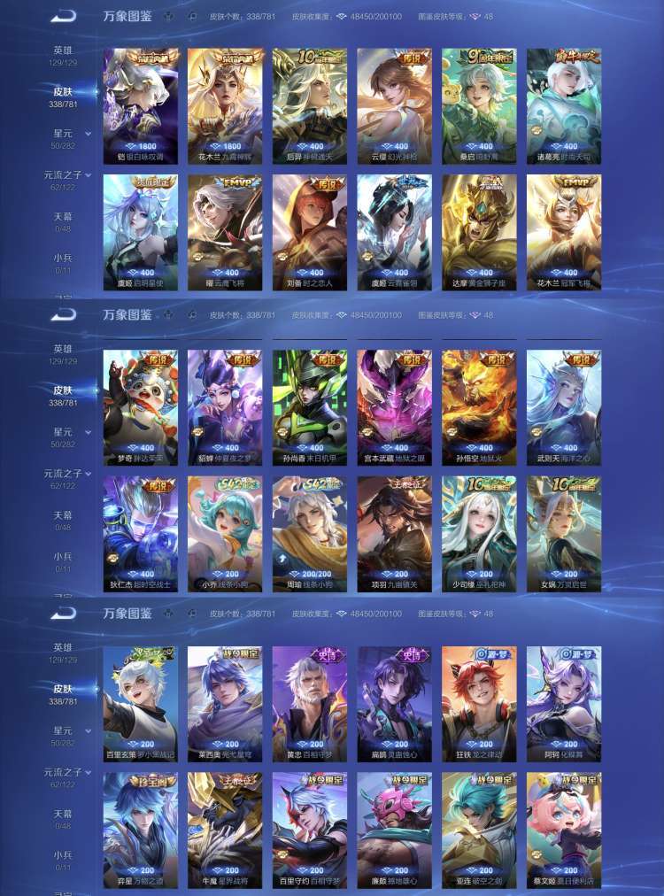 全英雄 3个典藏 18个传说101个史诗总共338个皮肤 超多皮肤 高级铭文