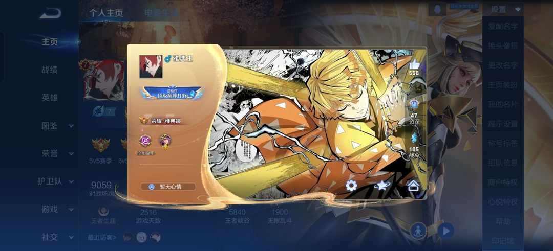 主流英雄均有皮肤,铭文满级,有一个打野金标
