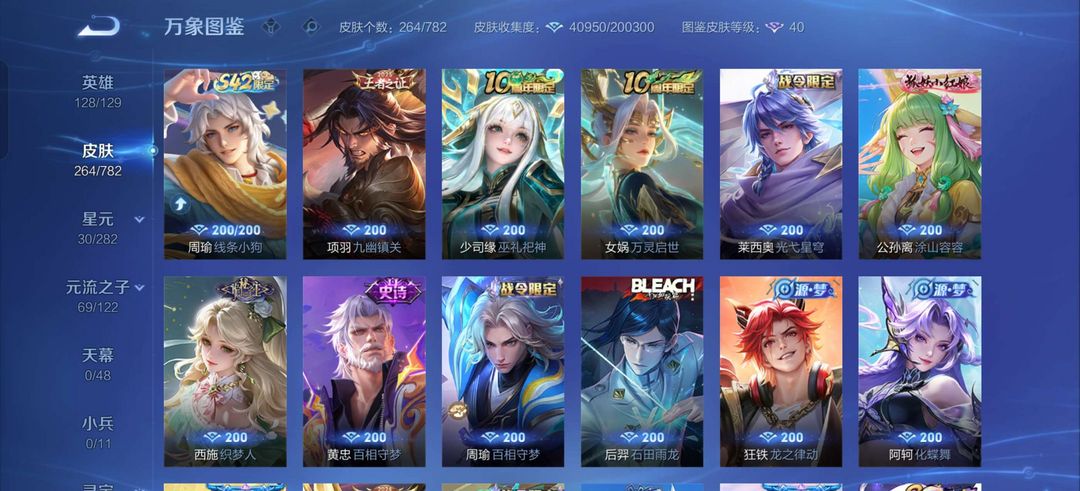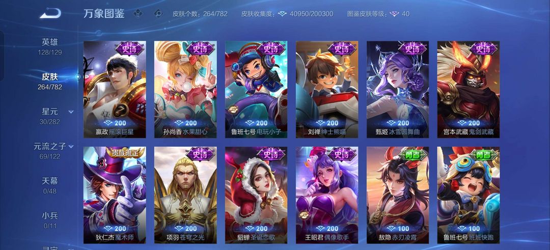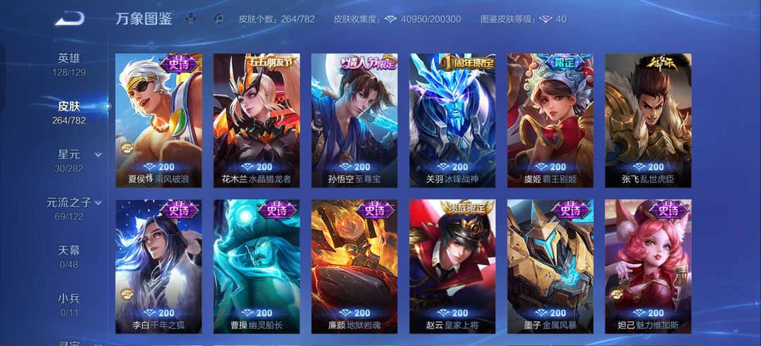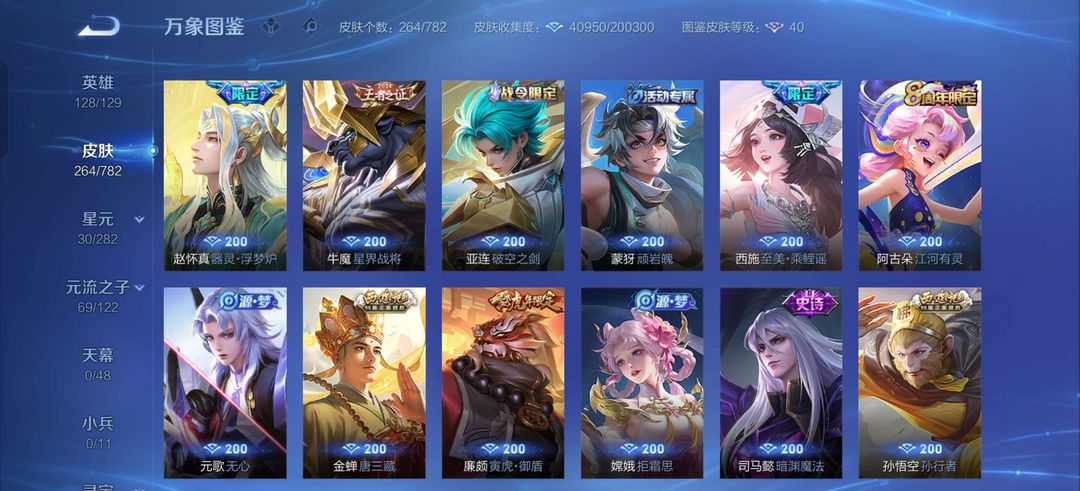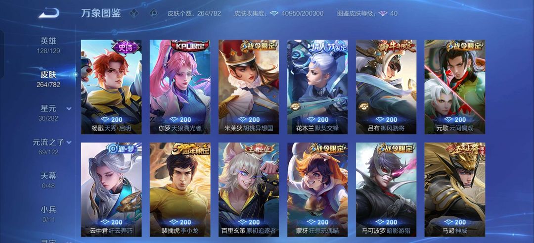 典藏,怪盗基德,至尊宝,狄仁杰马年限定,虞姬/澜蛇年限定,遇见神鼓,李信山海.炽霜斩,武圣冰封战神