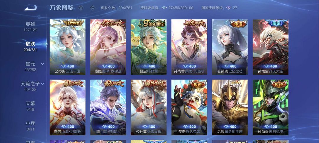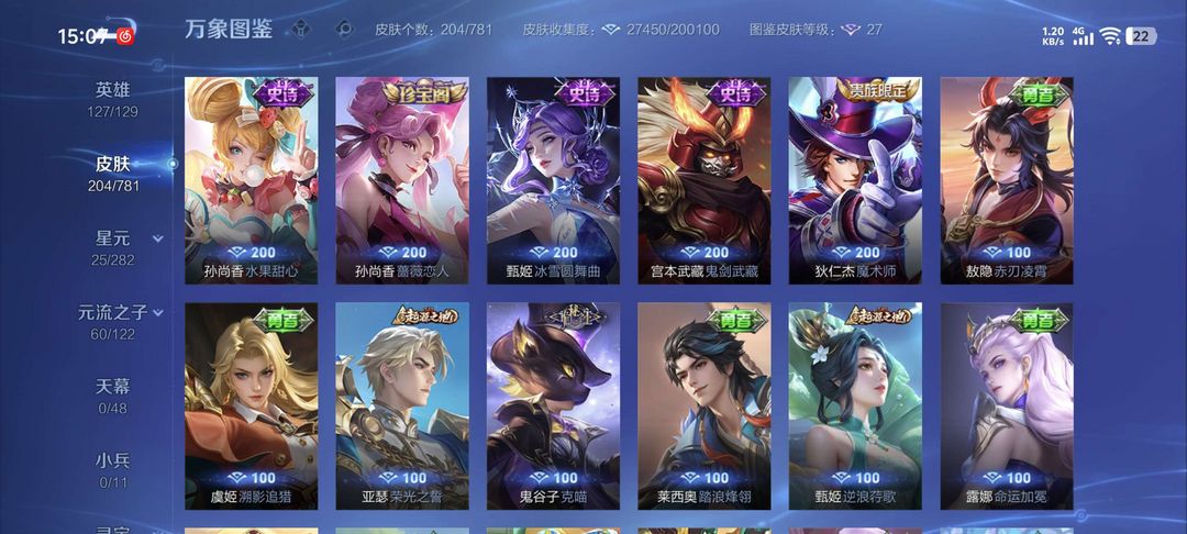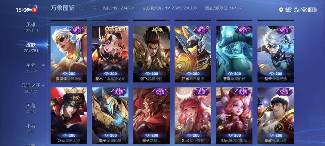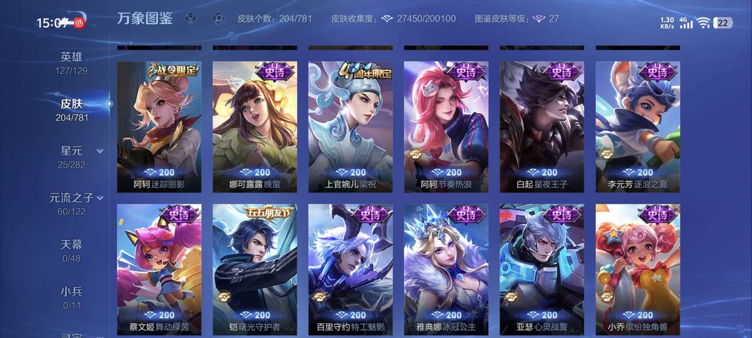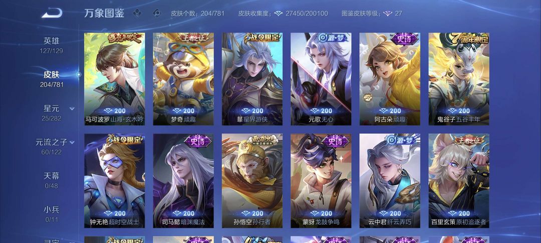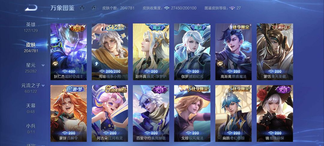 传说13个,5个年限,还有很多很多,这只是一部分一共204个皮肤,希望你可以租我的号,祝你玩的愉快!