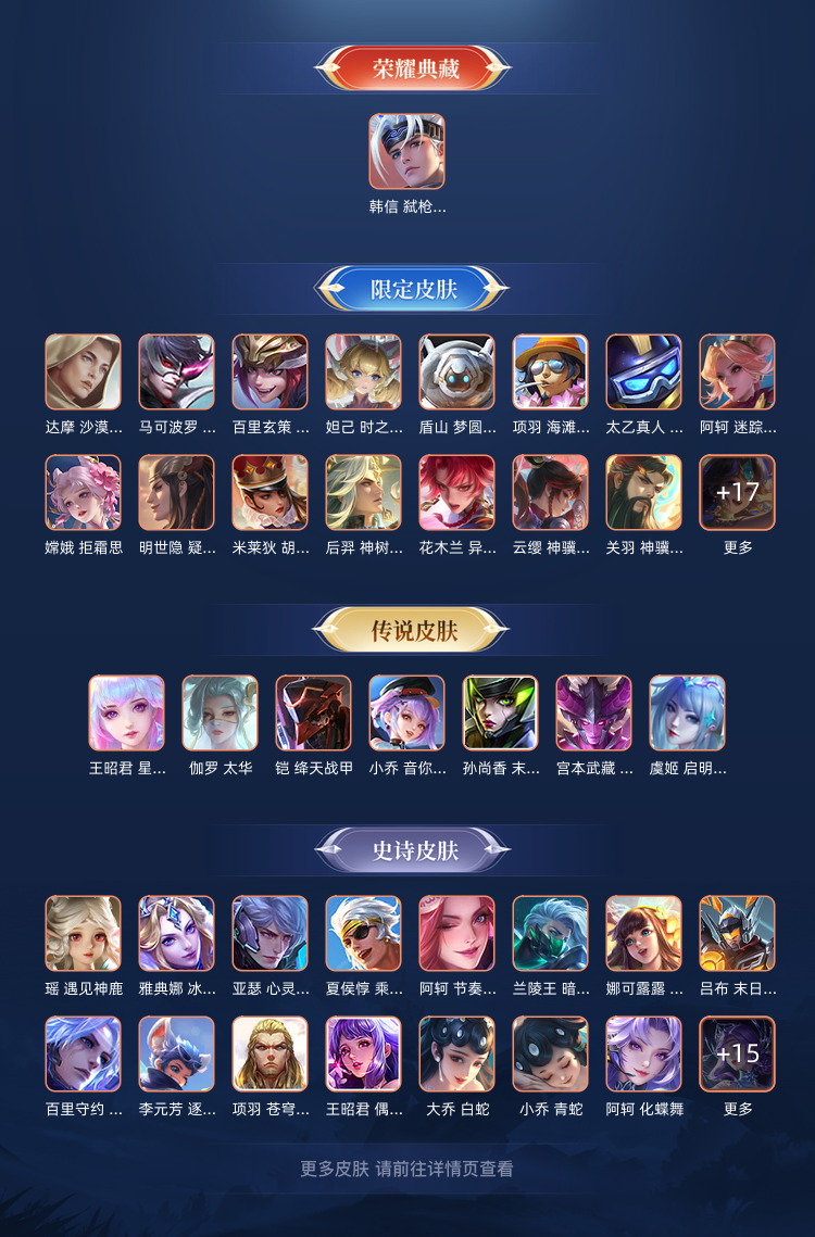装备描述:李元芳1988星君丶娄金 曹操1588 百里玄策传白虎志 韩信传说踏浪归 荣耀典藏:韩信的“弑枪猎影”武则天 冰雪奇缘小兵皮肤 无双品质:李信“问心剑”、孙悟空“无相”、铠“神罪”、曜“器灵·螭龙剑” 传说/限定:甄姬“雪境奇缘”、公孙离“离恨烟”、李白“碎月剑心”、瑶“真我赫兹” 皮肤品质和名字: 传说:桑启「鸣野蒿」、庄周「牧神诗旅」、海月「金乌负日」、王昭君「星穹之声」 限定:夏侯惇「霜北刀」、朵莉亚「心动手记」、孙尚香「乘龙·问璇玑」、澜「逐花归海」、露娜「霜月吟」、孙膑「小动物乐团」、大乔「时之奇旅」、赵云「乘龙·铭钟鼎」