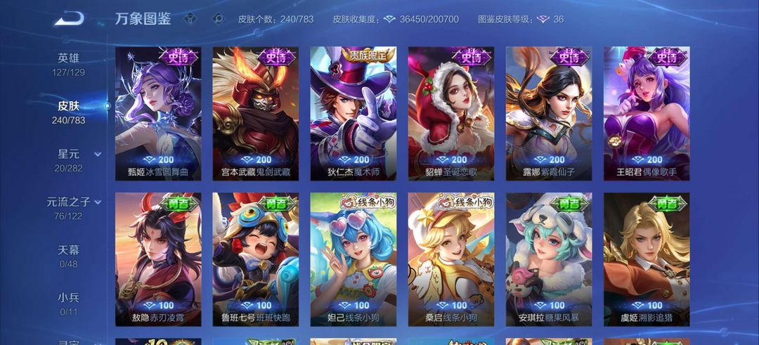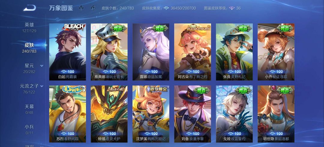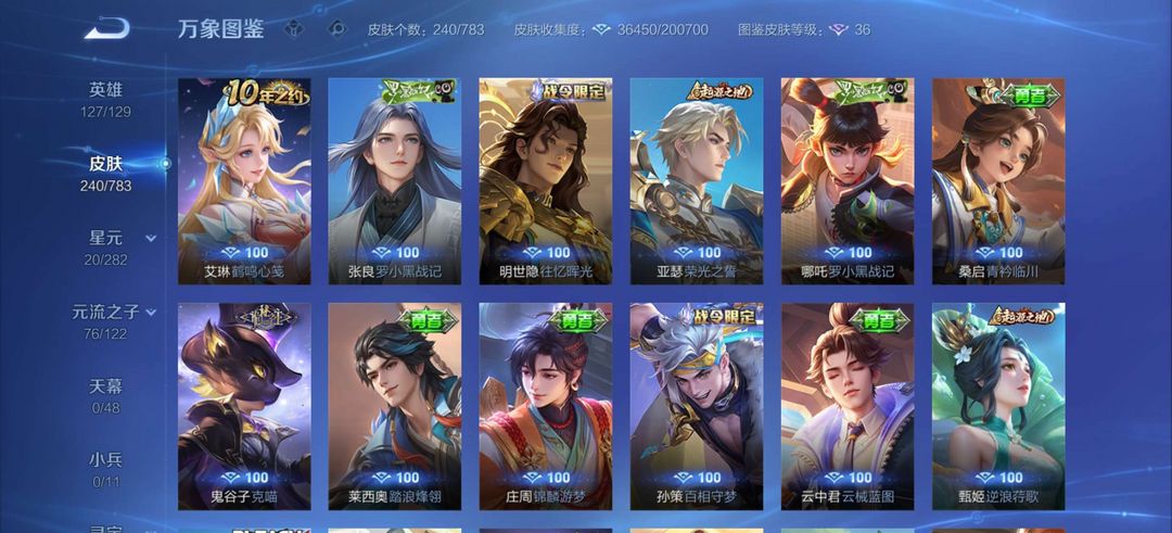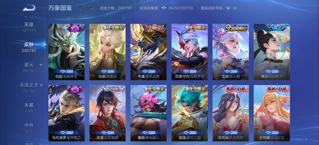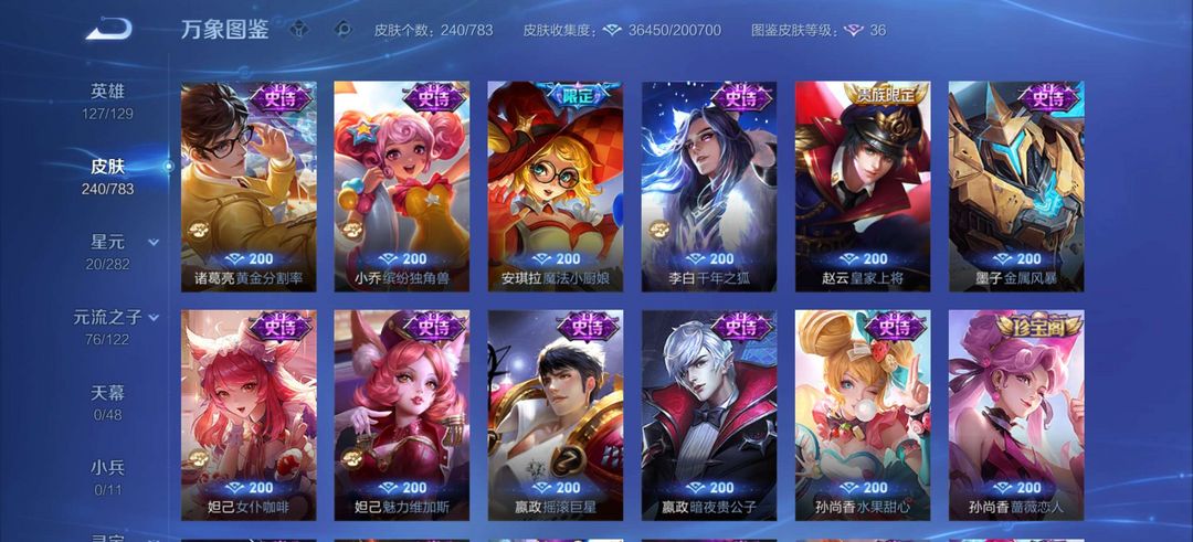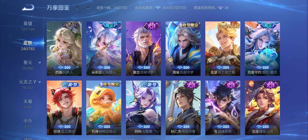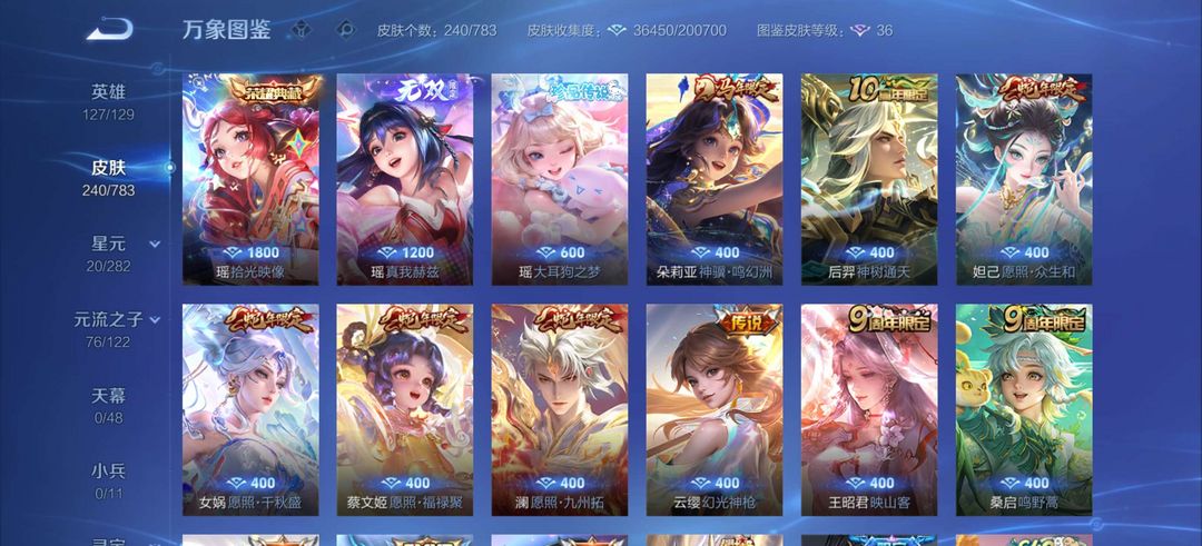 装备描述:软辅中路皮肤较多,瑶和朵莉亚无情限其他全皮,想玩的不要错过哦