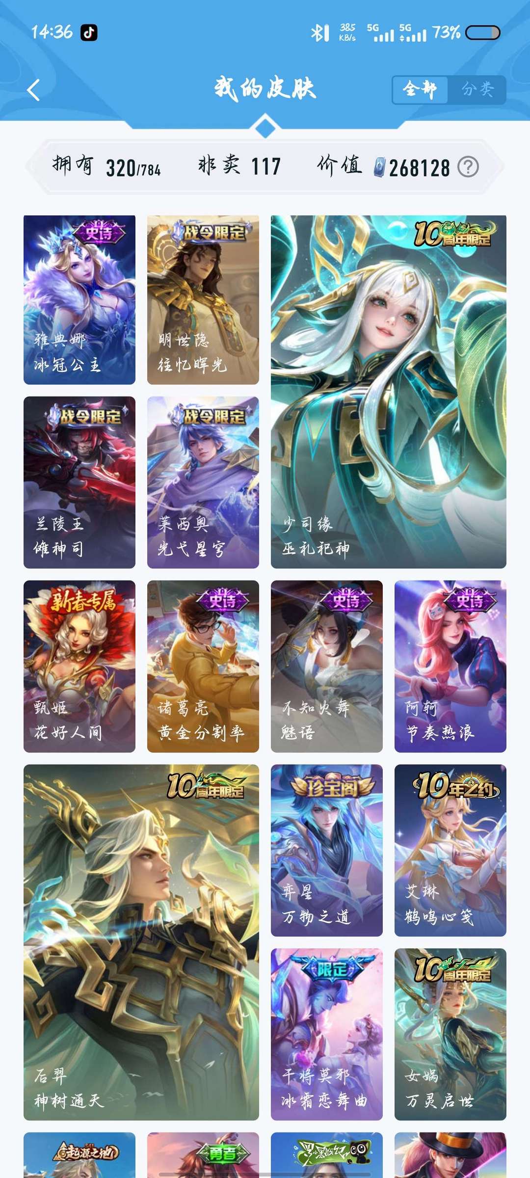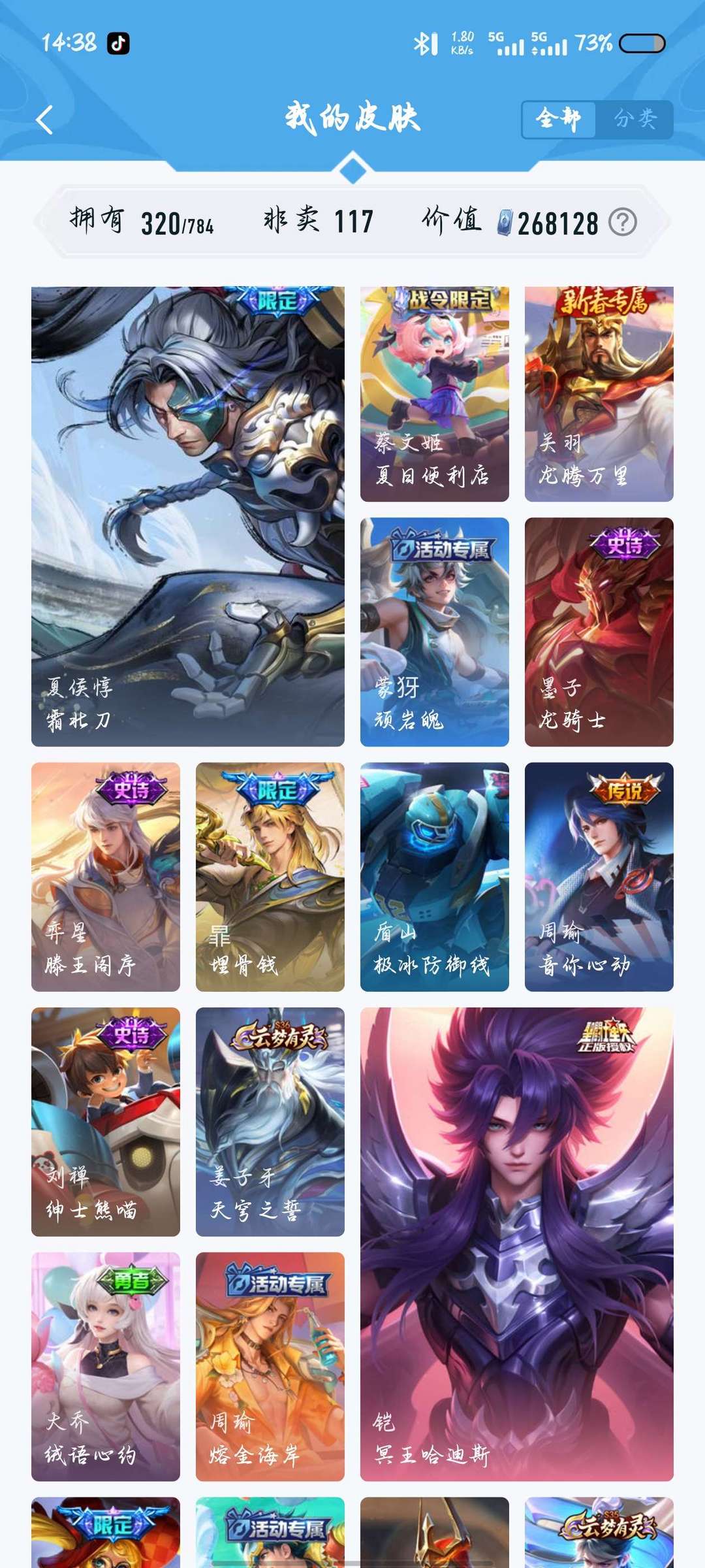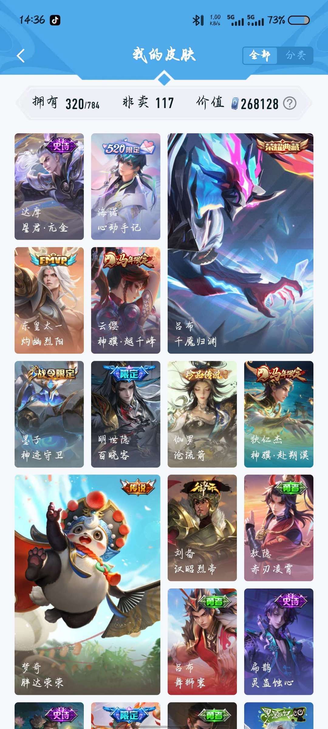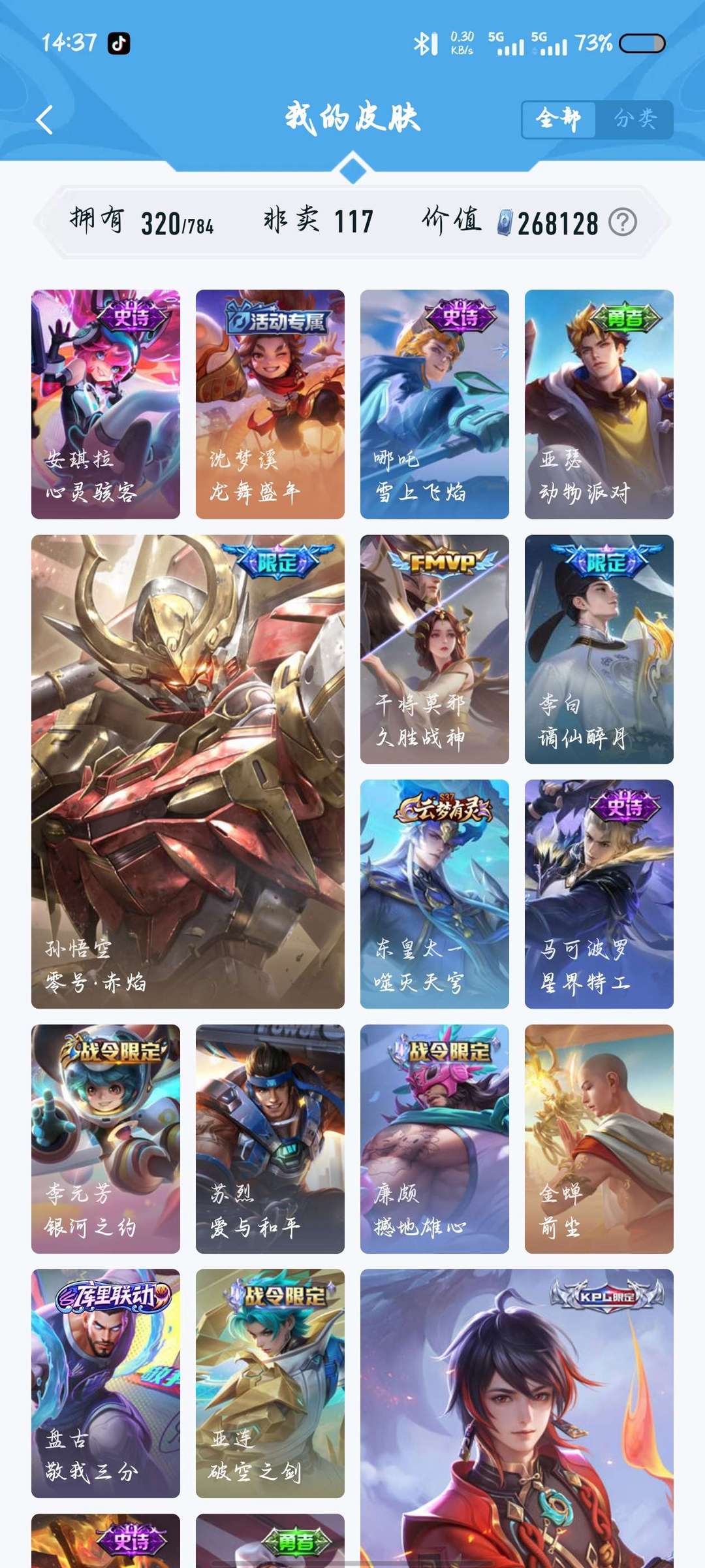 320皮,两典藏,千魔归渊,星域神启,20传说,114史诗117英雄,可打排位