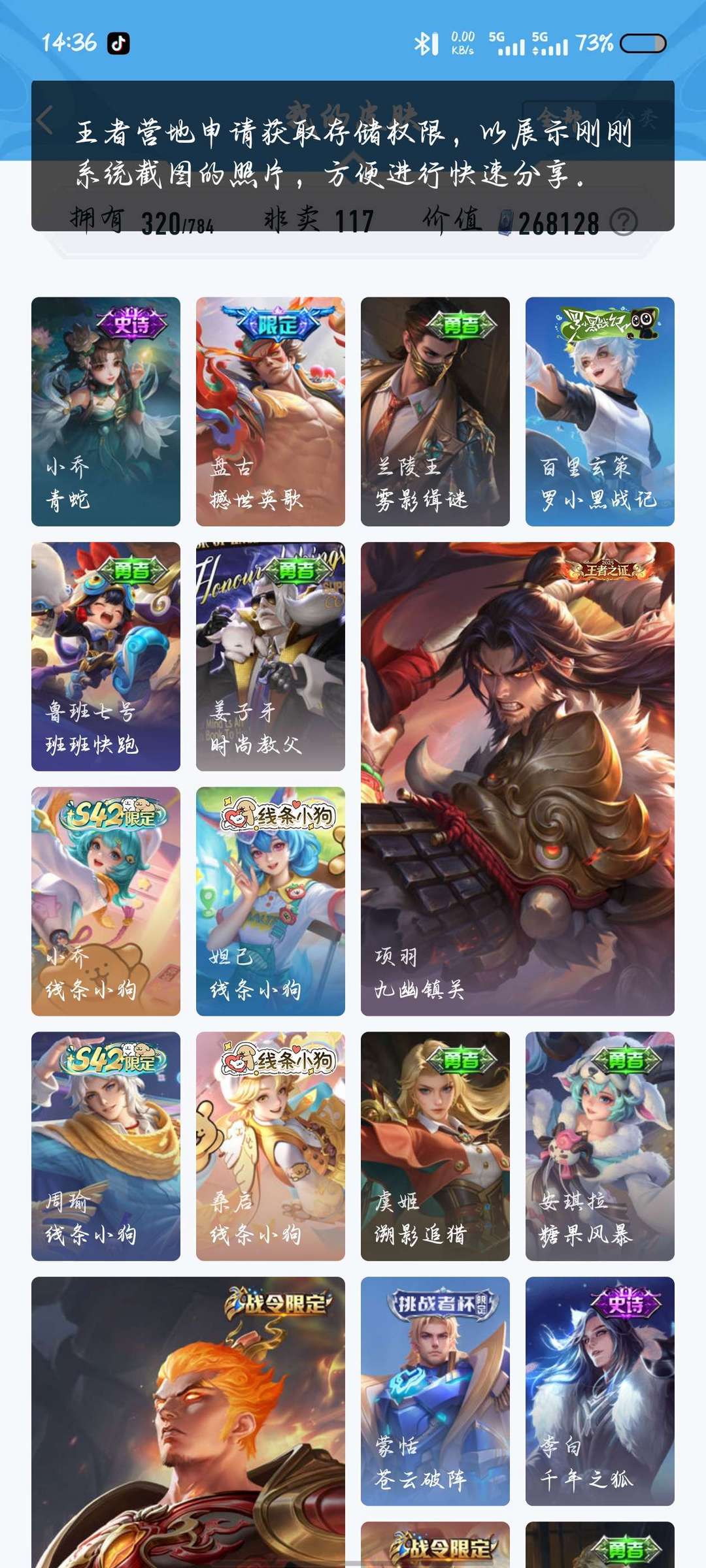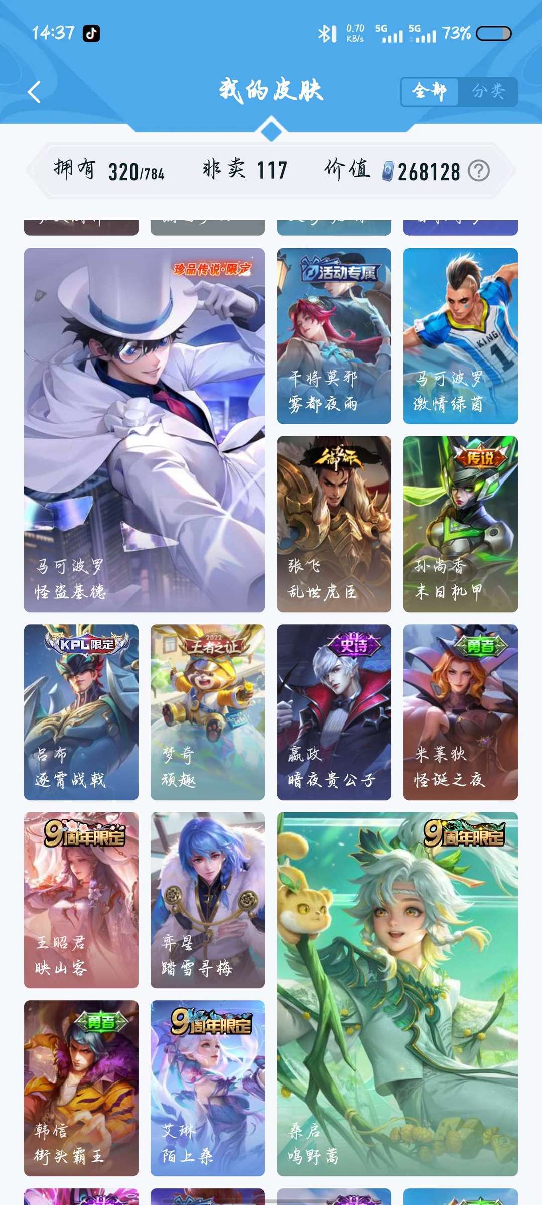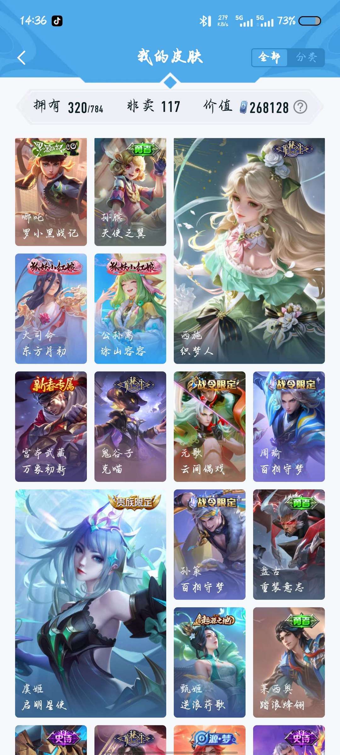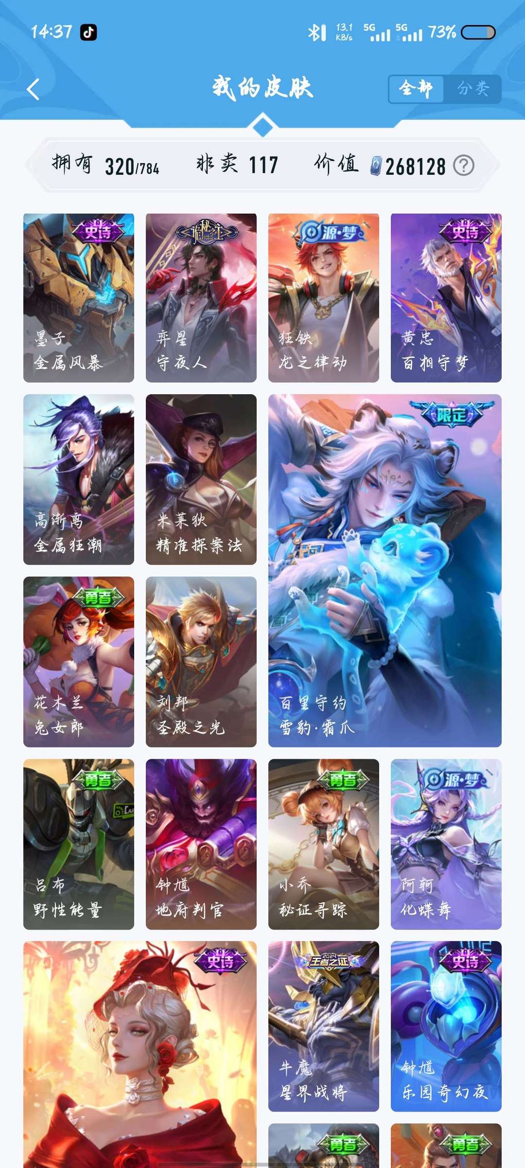 320皮,两典藏,千魔归渊,星域神启,20传说,114史诗117英雄,可打排位