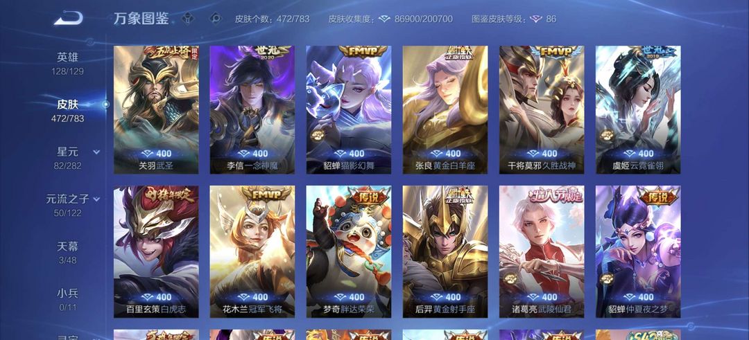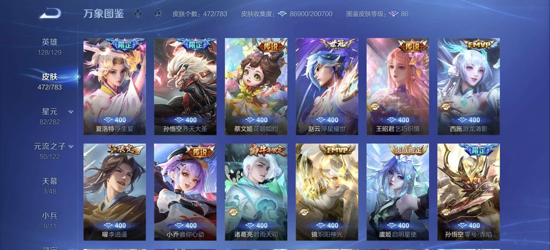 472皮肤 v10 11典藏 35传说 148史诗 韩信无双