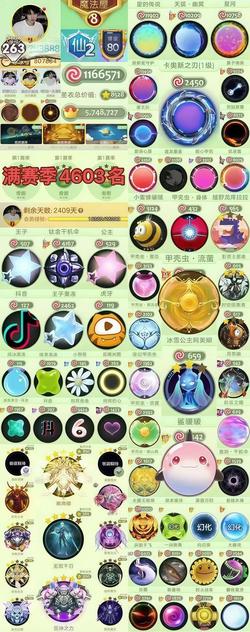 ❤满赛季4603名真排名❤王子公主卡奥斯之刃❤钛金千机伞王子果冻虎牙❤六款甲壳虫大嘴花以及各种幻化皮