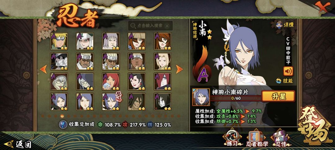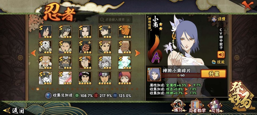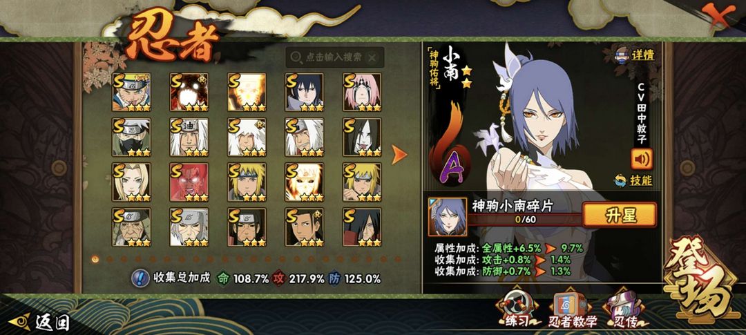 装备描述:神驹小南皮肤,新春小南,新春水门,侠隐忍者全系列,还有众多稀有S忍者,熊猫通灵超强反手