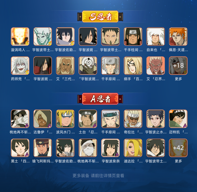装备描述:S忍:十尾人柱力宇智波带土,秽土转生解宇智波斑,白面具宇智波斑,忍界大战宇智波带土,须佐能乎旗木卡卡西,秽土转生千手扉间,超佩恩天道,九喇嘛连结波风水门,天道佩恩,传说中的三忍自来也,漩涡鸣人宇智波佐助,秽土转生千手柱间,木叶创立宇智波斑,永恒万花筒宇智波佐助,忍界大战艾,舞之豪杰自来也,大蛇丸,百豪纲手,波风水门,秽土转生波风水门,千手柱间,秽土转生宇智波斑,须佐能乎宇智波鼬,红夜之刃神秘面具男,秽土转生长门,三代目雷影艾,四代目雷影艾,仙人模式药师兜,死门迈特凯,忍界大战春野樱,九喇嘛连结漩涡鸣人,大筒木金式,秽土转生猿飞日斩,自来也;A忍:青春爆炸迈特凯,仙人模式巳月,幻之真容旗木卡卡西,忍界大战李洛克,忍界大战日向宁次,四代目土影黑土,猿飞木叶丸,青年长门,秽土转生迪达拉,宇智波止水,新春限定宇智波止水,新春限定迪达拉,忍界大战奇拉比,青年波风水门,青年艾,漂泊武士千手扉间,漂泊武士桃地再不斩,近松十人卫千代,半蛇斗篷药师兜,须佐能乎宇智波佐助,九尾查克拉漩涡鸣人,七夕限定猿飞阿斯玛,暴怒宇智波带土,晓大蛇丸,百豪春野樱,忍界大战秋道丁次,忍界大战我爱罗,新春限定波风水门,夏日