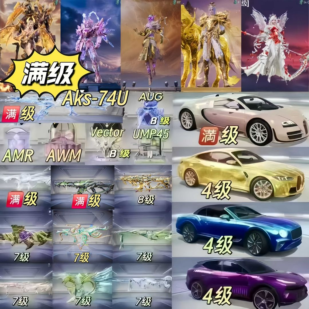 满级新红装艾丽娅/12把9级枪均7级以上/老1小丑雪国激光眼罩/4种不同载具类型均高级外观/禁止拆解
