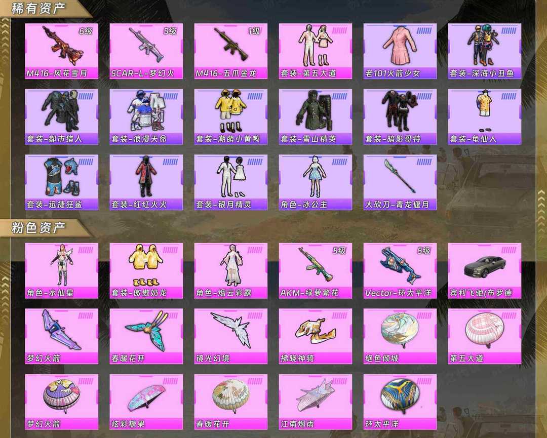 4粉套5升级枪1载具⚡老101⚡m4五爪金龙风花雪月⚡第五大道⚡深海小丑鱼主副套都市猎人⚡宾利