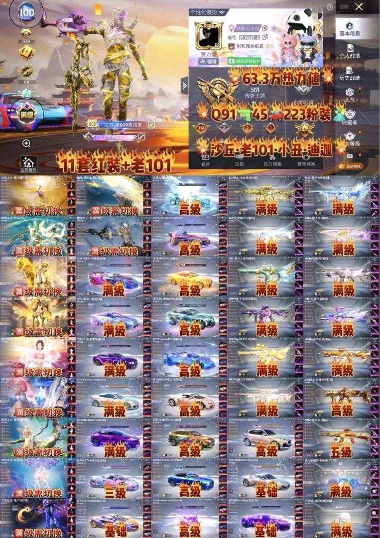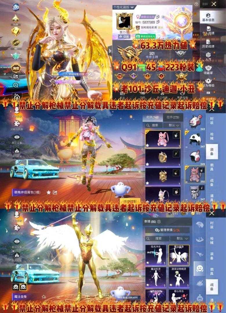 限制: 租号10次及以上 | 撤单率<30%才可租用此帐号装备描述:请勿撩骚卡泡,涉政也会导致封号,以上行为导致封号起诉索赔。 此号价值较高不文明游戏导致封号,一律按照充值金额起诉索赔毁号,禁止分解枪械车辆,恶意分解枪械车辆,一律起诉索赔, 涉及毁坏虚拟财产罪及计算机安全罪,请文明游戏素质游戏,让我们共建美好租号平台 ,供您畅选,感受良好游戏体验! 注意事项: A.游戏过程中请不要恶意挂机或者不文明发言 B.恶意挂机、顶号等行为将被拉黑无法再次下单 C.进入游戏后中途请勿退出登陆,否则无法再次上号 D.部分账号由于异地登录可能会出现密码错误提示,通常再尝试5-6次后可上号 喜欢本账号请点 ☆收藏☆ 方便下次租用号,涉及毁坏虚拟财产罪及计算机安全罪,请文明游戏素质游戏,让我们共建美好租号平台 本游戏账号:133粉64枪20载具内含1飞机3级猫爪手雷星空马 满级红装:精灵之光露米娜、欧若拉、木乃伊、熬渊、妮芮妲 满炫光金宾利皇家紫彩虹光 五级宾利GT 满级甜心首席 满级万古烈焰 满级熔岩统帅 满级玉魂精魄 满级超新星gz 满超新星m4 满级沙漠p90 7级盖世英雄 5级仙履奇缘 5级至情至圣 5级宾利蓝色 5级宾利炫光 1级杜卡迪紫 1级玛莎