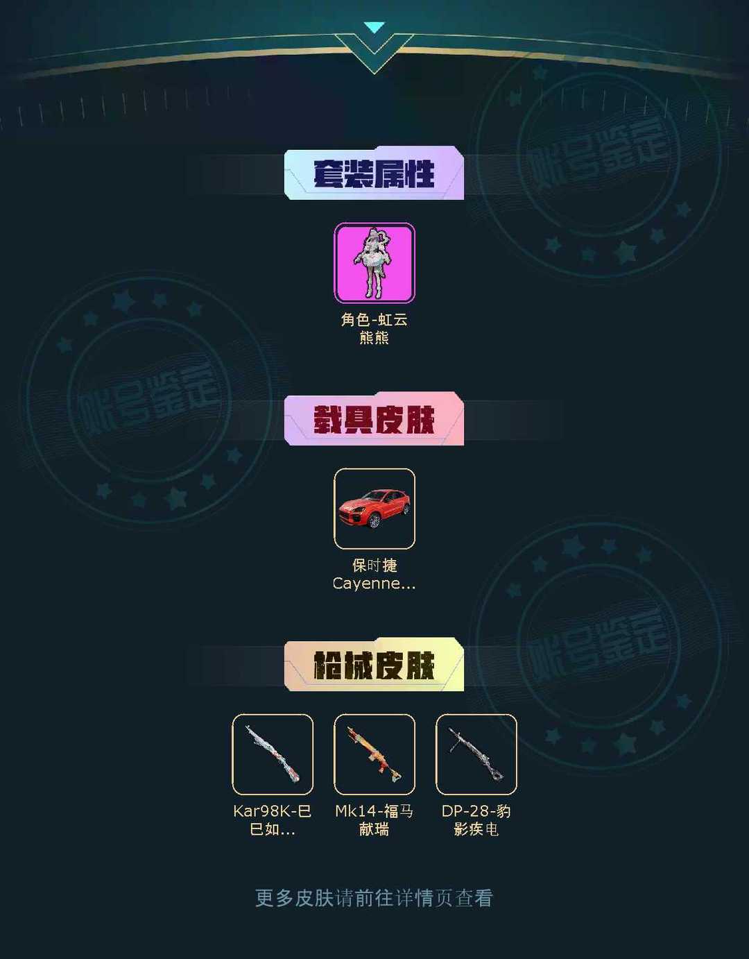 装备描述:【不朽星钻V1粉1载具111套装/13王牌印记】超级王牌11星❤️34354热力值❤️Mk14福马献瑞❤️DP-28豹影疾电❤️Kar98K巳巳如意❤️保时捷Cayenne(激情红)
