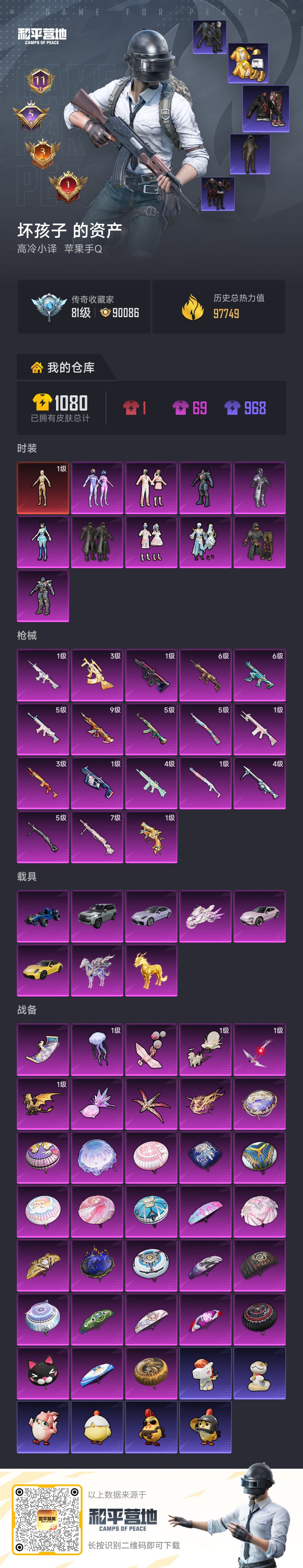 限制: 租号3次及以上 | 撤单率<50%才可租用此帐号装备描述:1红10粉18枪8载具 战神框 图卡盟 暗夜之虎 都市 赤蝎 金鞋 红眼罩 极限特训 深海小丑鱼 新101 萌熊背包 9级至情至圣M4 6级天蓬元帅SCAR 3级精灵之光GZ 天马神君M4 保时捷 仰望U8(绿)