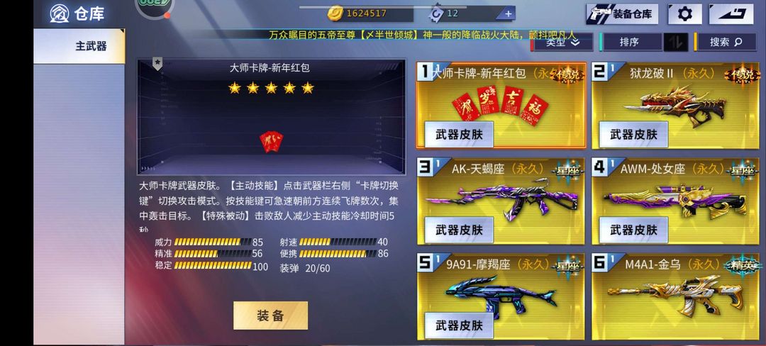 装备描述:喜欢本账号请点 ☆收藏☆ 方便下次租用,谢谢光临惠顾! 猫狗套,神启,破军,,超感猎杀,先锋号,天蝎,魔蝎,天秤,处女座,大师卡牌,狱龙破,狮心,金甲,空之镜,an94征途等等,欢迎探索! 欢迎游玩