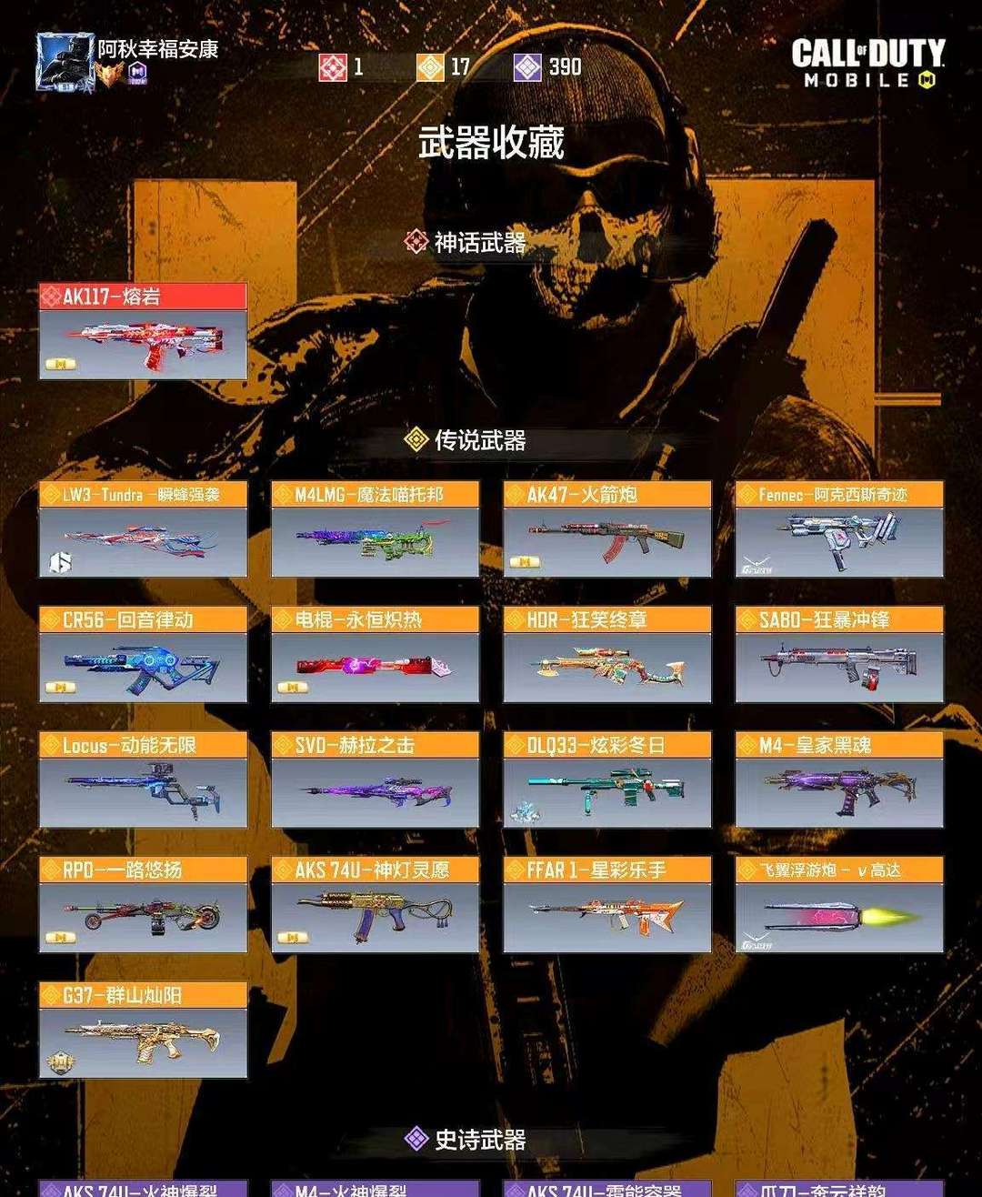 装备描述:介绍不全详细看图片 动能无限 Q33炫彩冬日 SVD-赫拉之击 LW3瞬蜂强袭 短剑飞翼浮游炮高达 SA8D-狂暴冲锋 HDR-狂笑终章 G37-群山灿阳 M4LMG-魔法喵托邦 电棍-永恒炽热 CR56-回音律动 AK47-火箭炮 FFAR - 星彩乐手等...(开挂或封号必追究)!!!